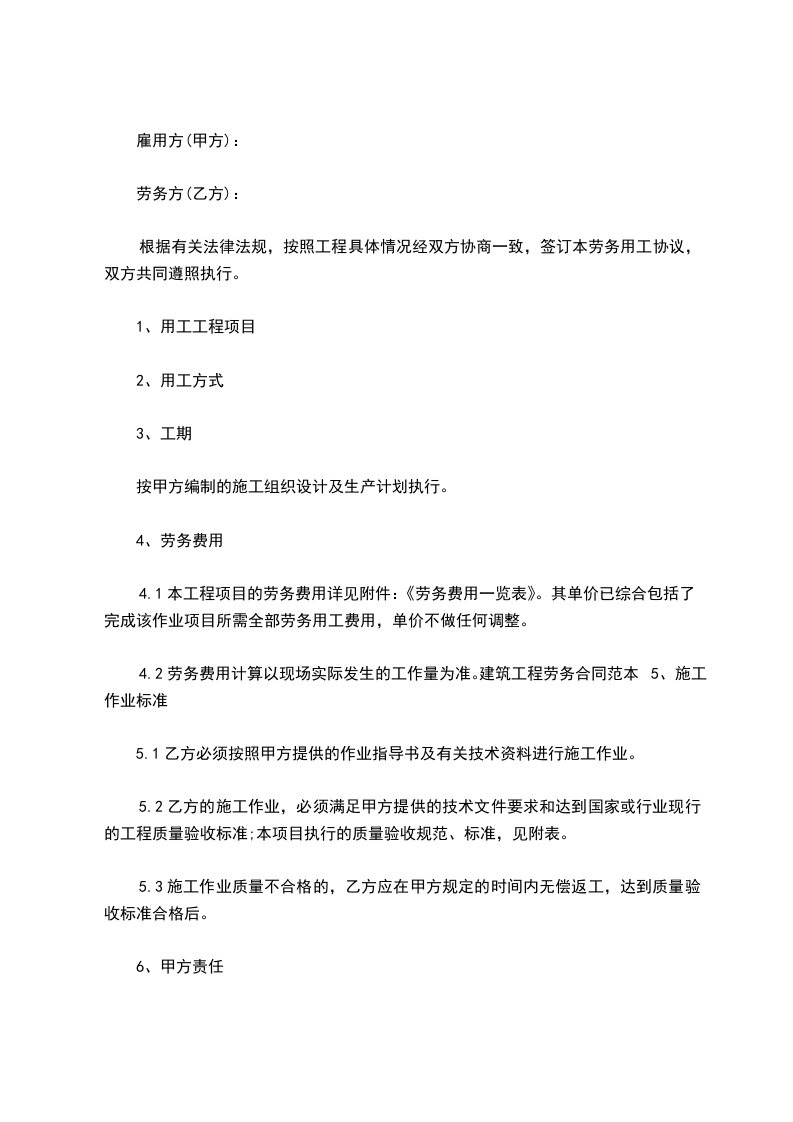 4.2劳务费用计算以现场实际发生的工作量为准。建筑工程劳务合同范本5、施工作业标准