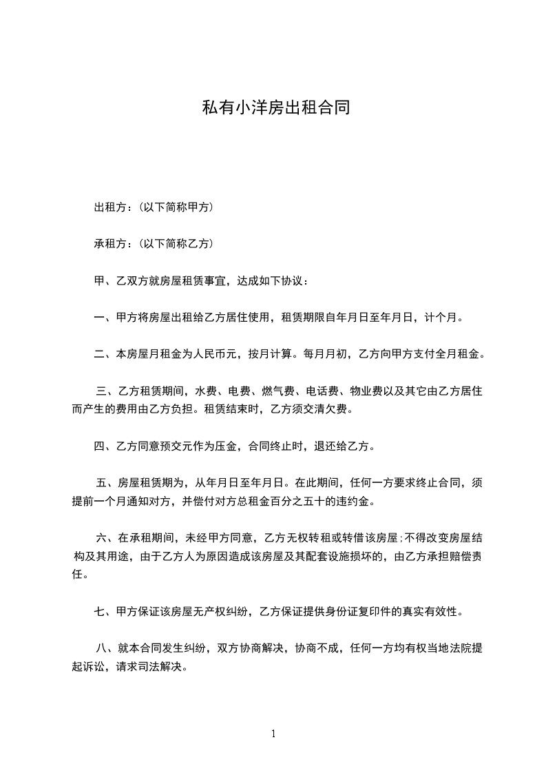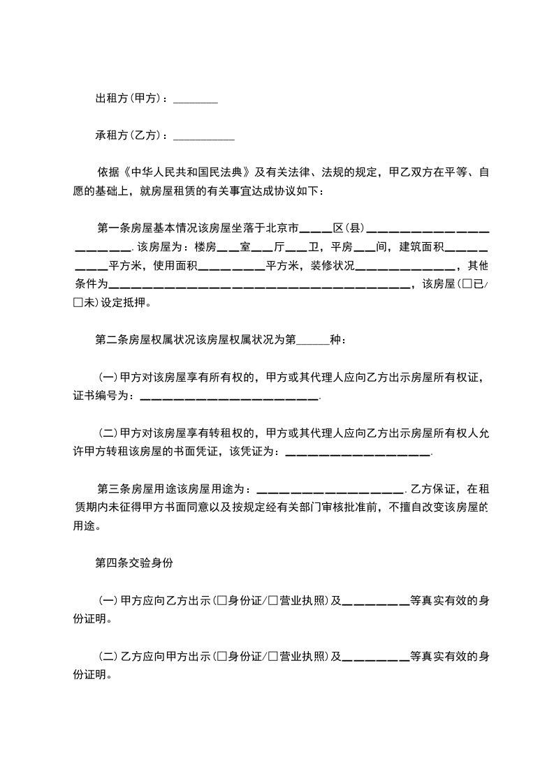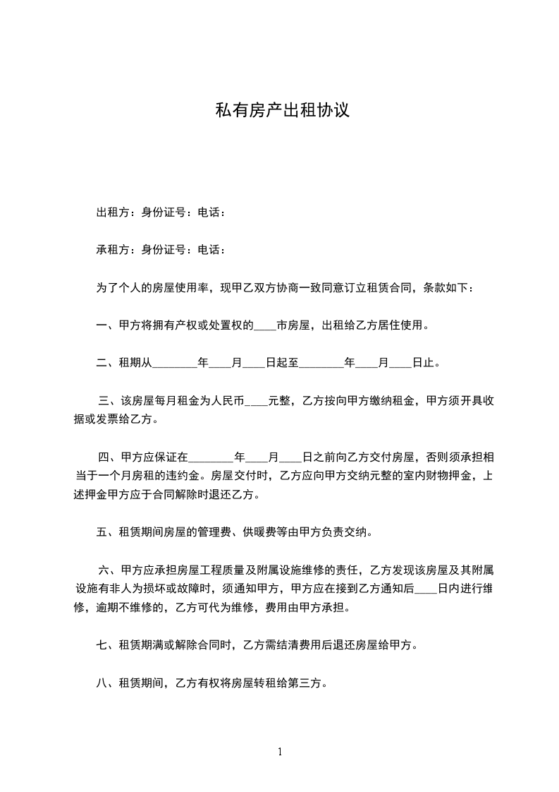 一、甲方将房屋出租给乙方居住使用,租赁期限自______年____月____日至______年____月____日,计_____个月。
