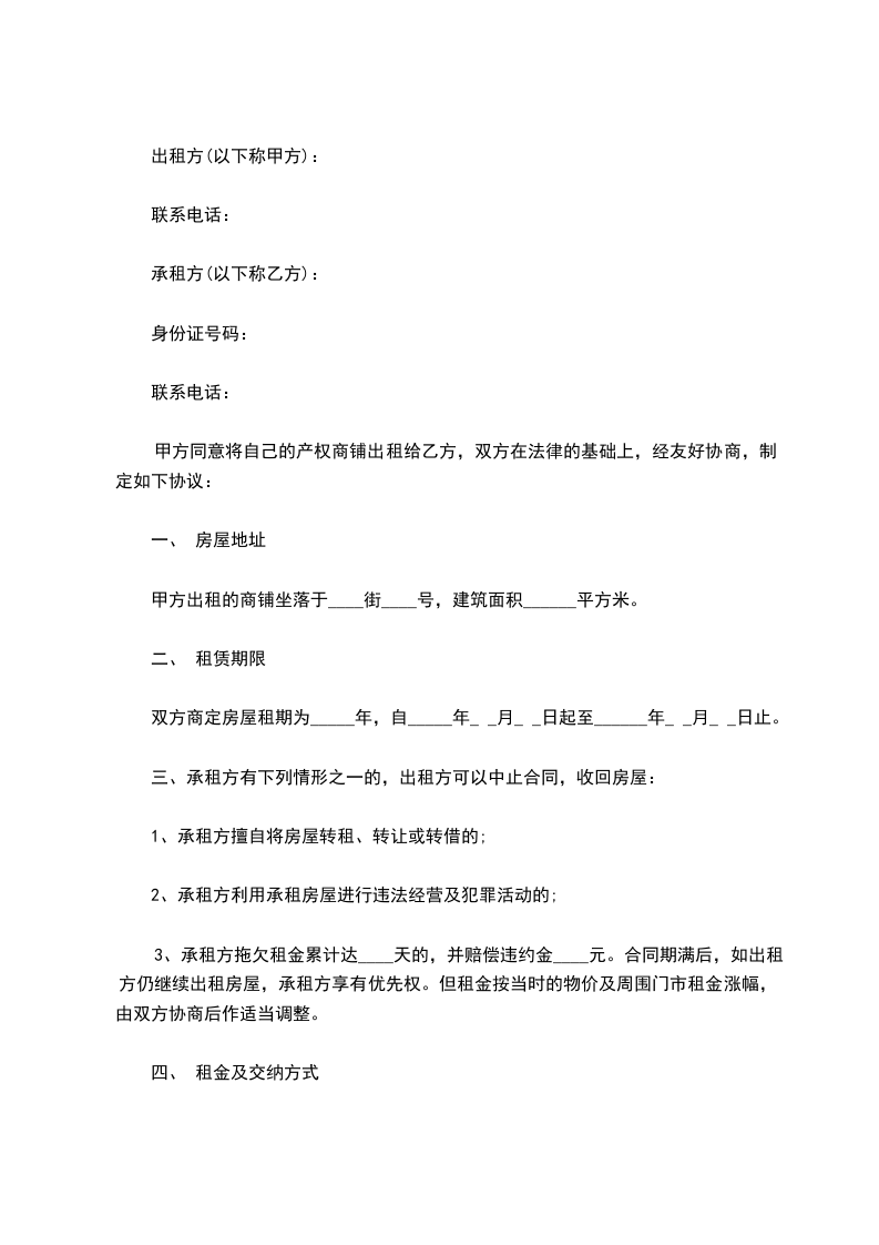 五、房屋租赁期为,从______年____月____日至______年____月____日。在此期间,任何一方要求终止合同,须提前一个月通知对方,并偿付对方总租金百分之五十的违约金。