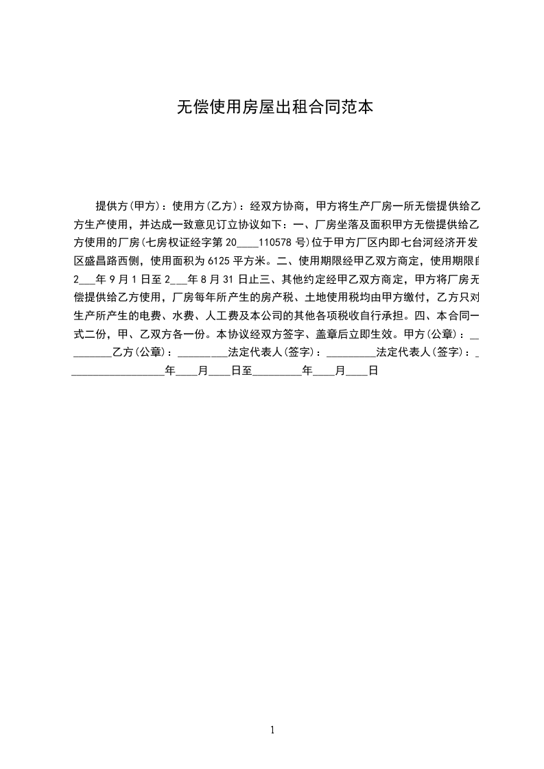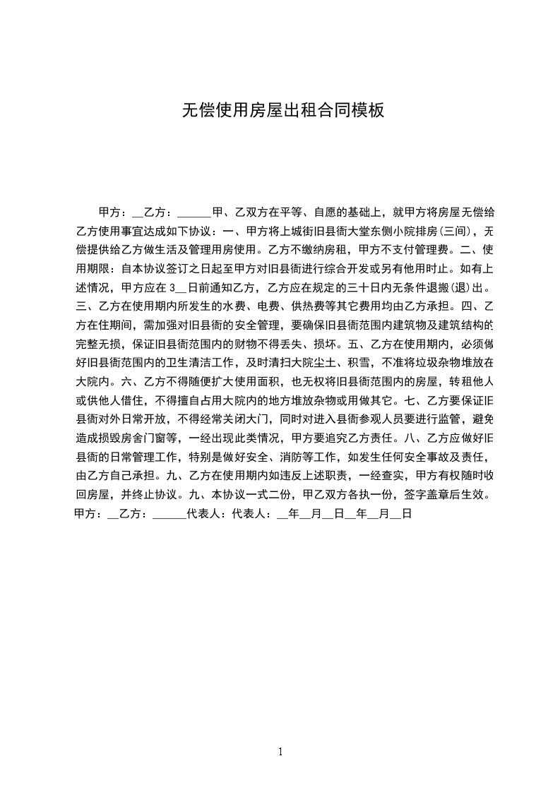 一、甲方将上城街旧县衙大堂东侧小院排房(三间),无偿提供给乙方做生活及管理用房使用。乙方不缴纳房租,甲方不支付管理费。
