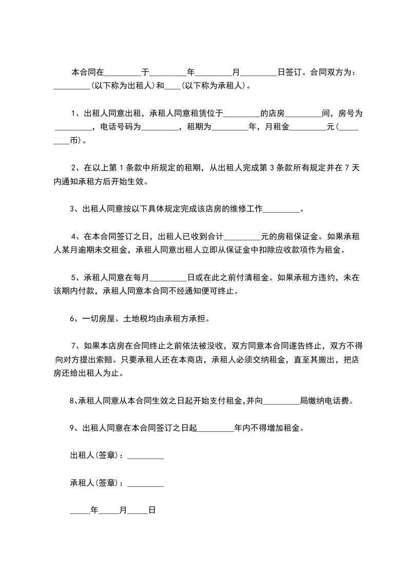 7、如果本店房在合同终止之前依法被没收,双方同意本合同遂告终止,双方不得向对方提出索赔。只要承租人还在本商店,承租人必须交纳租金,直至其搬出,把店房还给出租人为止。