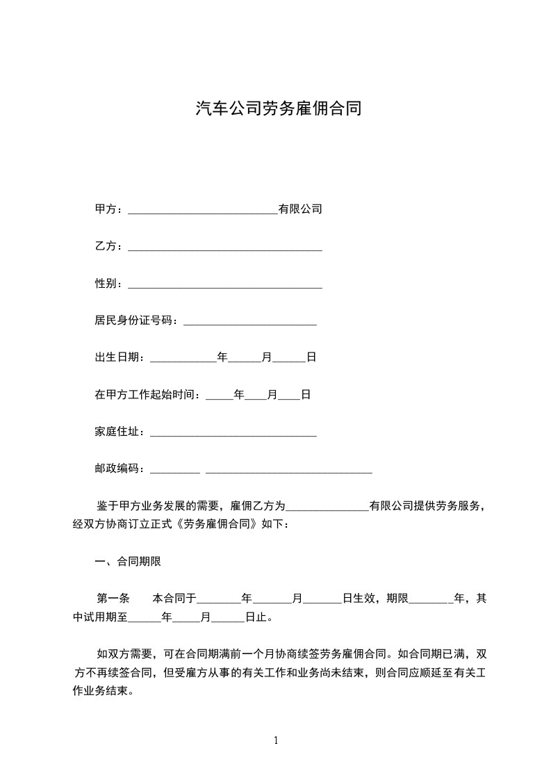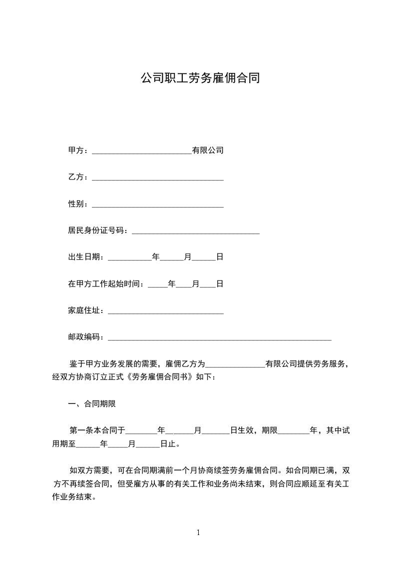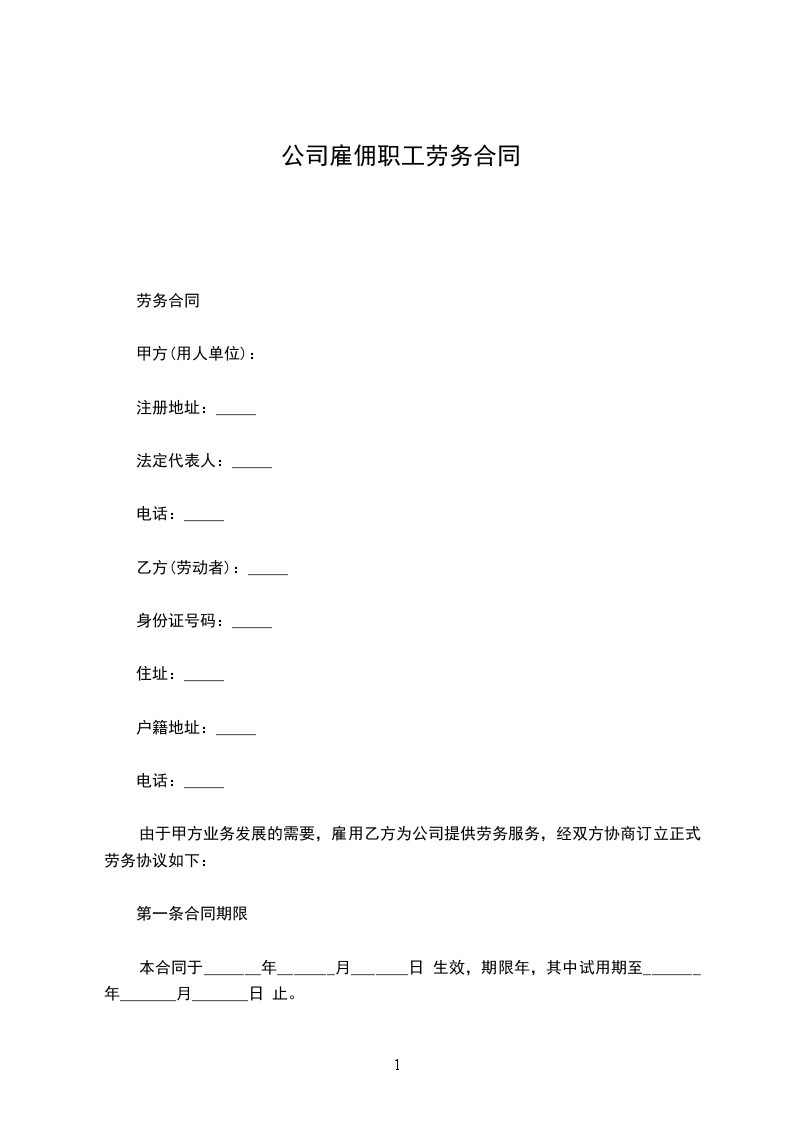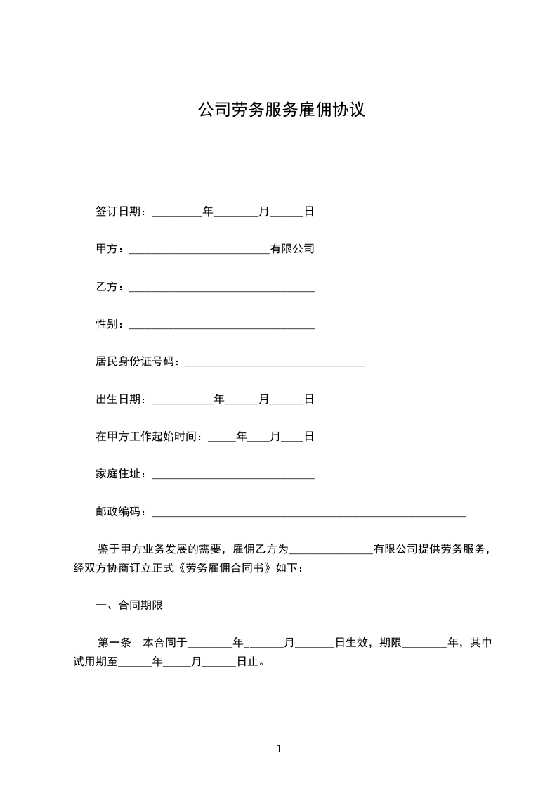鉴于甲方业务发展的需要,雇佣乙方为_______________有限公司提供劳务服务,经双方协商订立正式《劳务雇佣合同书》如下: