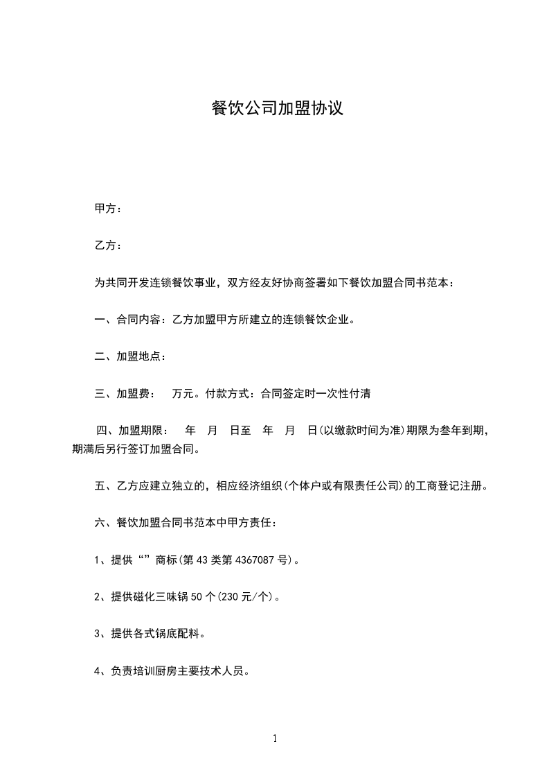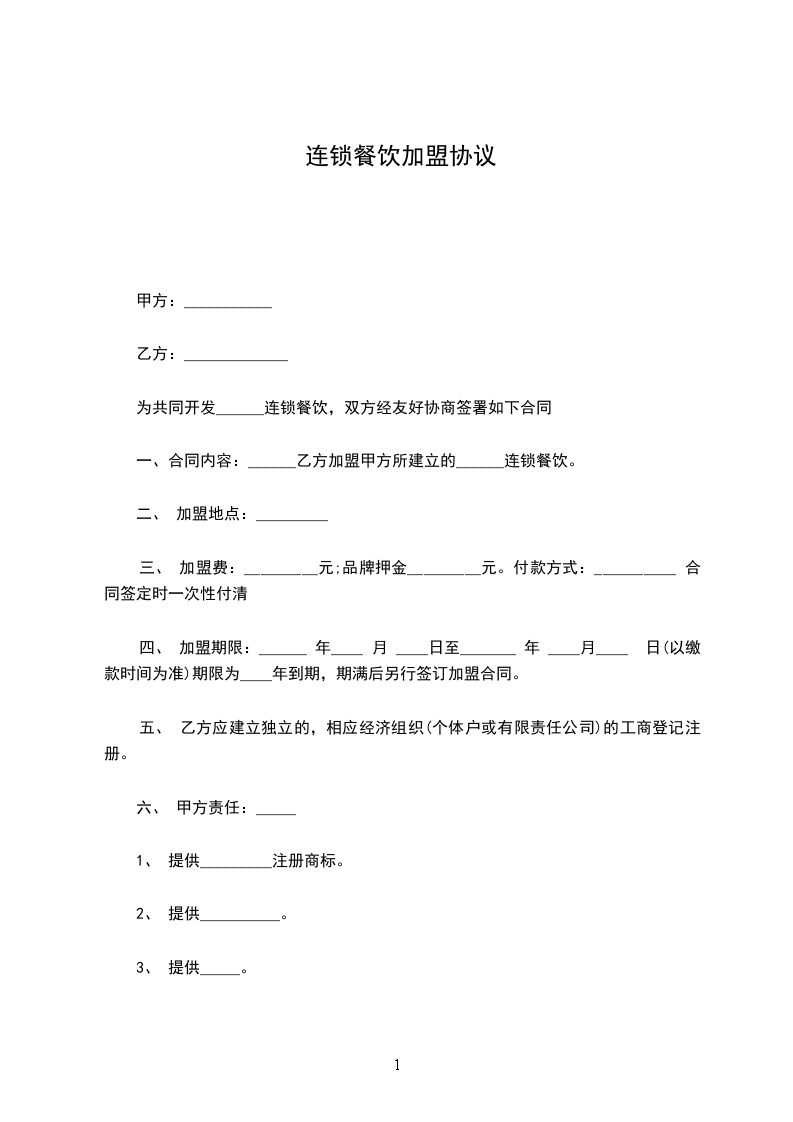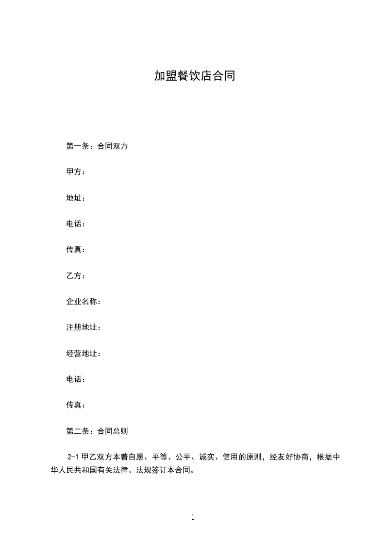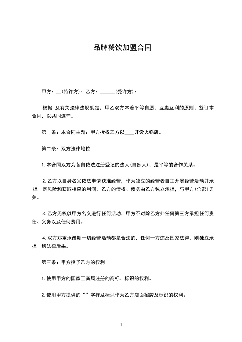 鉴于甲方有意加盟乙方的餐饮品牌,乙方拥有成熟的餐饮经营模式及品牌资源,双方经友好协商,依据《中华人民共和国民法典》等相关法律法规,就甲方加盟乙方餐饮事宜达成如下协议: