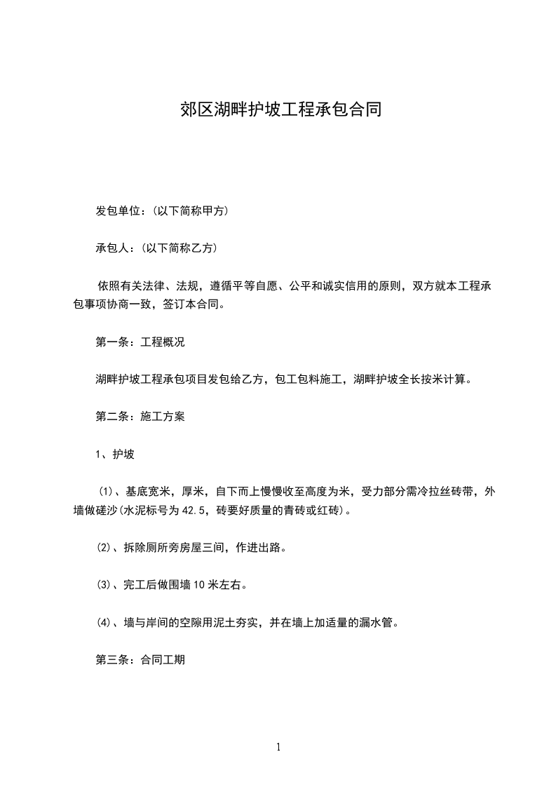 湖畔护坡工程承包项目发包给乙方,包工包料施工,湖畔护坡全长按米计算。