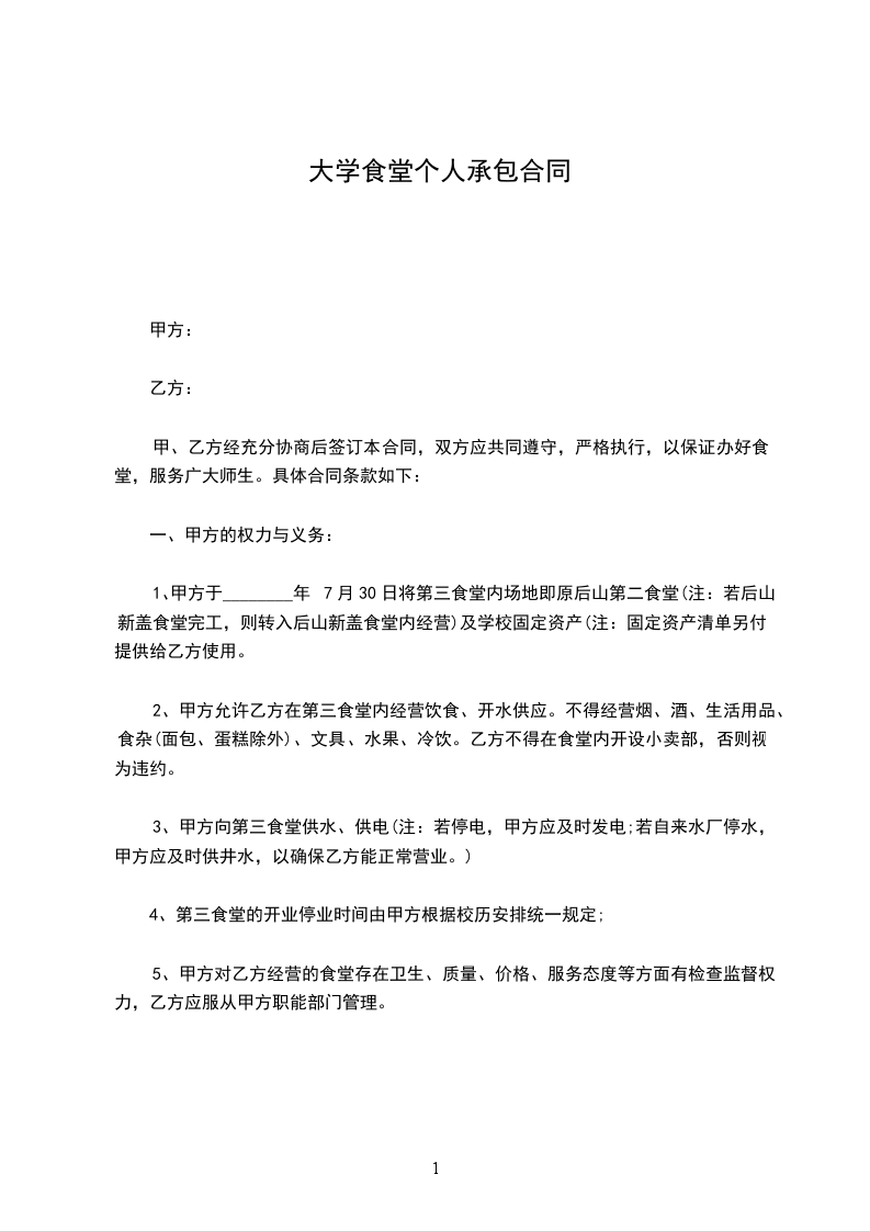 1、甲方于________年7月30日将第三食堂内场地即原后山第二食堂(注:若后山新盖食堂完工,则转入后山新盖食堂内经营)及学校固定资产(注:固定资产清单另付)提供给乙方使用。