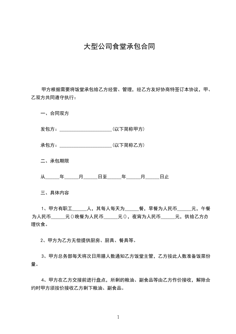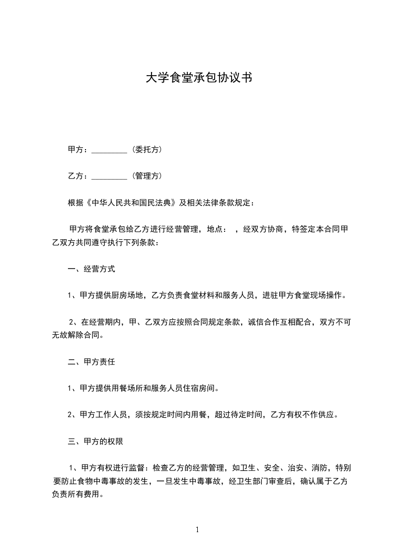 7、若乙方将所承包的食堂转包给他人经营,则甲方有权中止合同。乙方的风险抵押金及所交承包费不予退还外,且停聘乙方或乙方担保人三年。