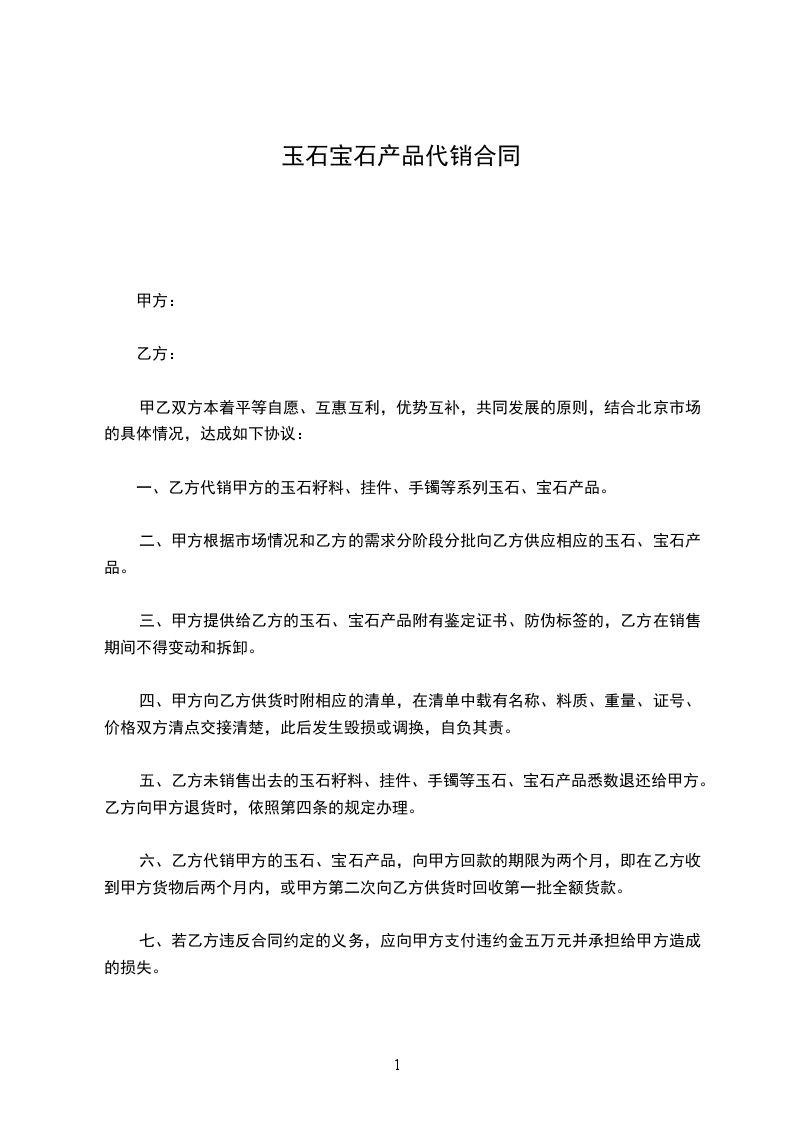 一、乙方代销甲方的玉石籽料、挂件、手镯等系列玉石、宝石产品。
