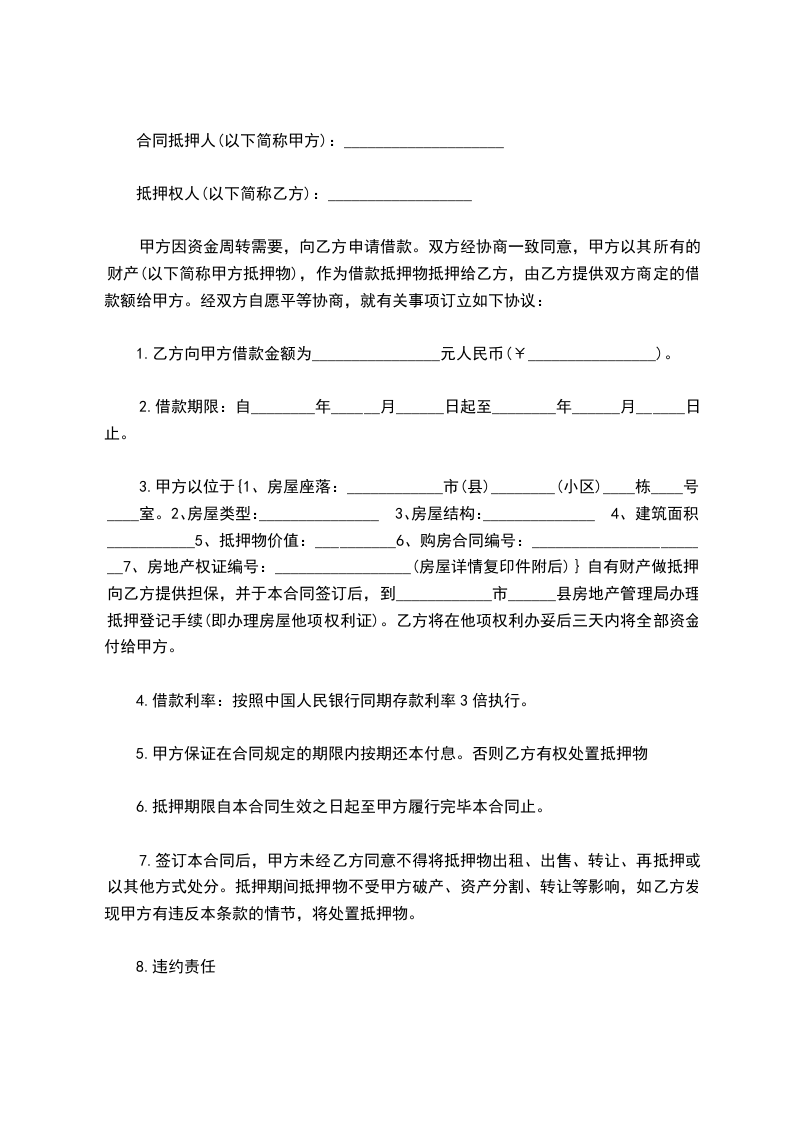 3.甲方以位于{1、房屋座落:____________市(县)________(小区)____栋____号____室。2、房屋类型:_______________3、房屋结构:______________4、建筑面积:___________5、抵押物价值:__________6、购房合同编号:_______________________7、房地产权证编号:_________________(房屋详情复印件附后)}自有财产做抵押,向乙方提供担保,并于本合同签订后,到____________市______县房地产管理局办理抵押登记手续(即办理房屋他项权利证)。乙方将在他项权利办妥后三天内将全部资金付给甲方。