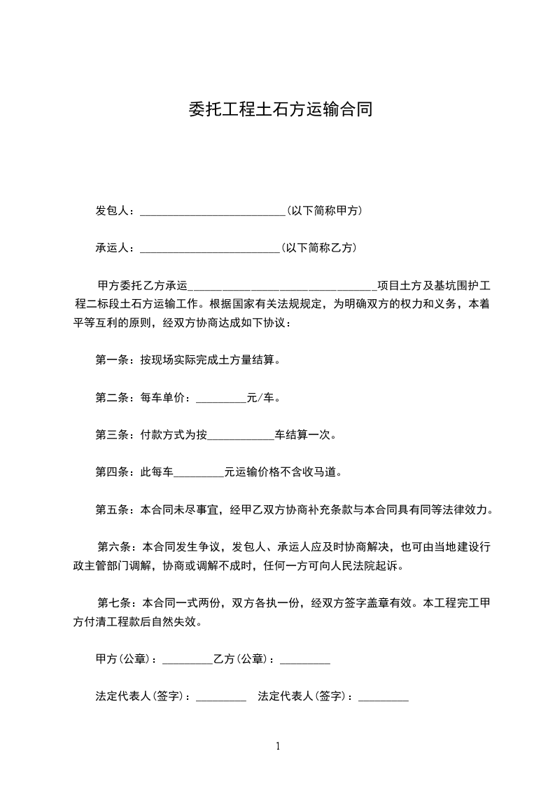 甲方委托乙方承运_________________________________项目土方及基坑围护工程二标段土石方运输工作。根据国家有关法规规定,为明确双方的权力和义务,本着平等互利的原则,经双方协商达成如下协议: