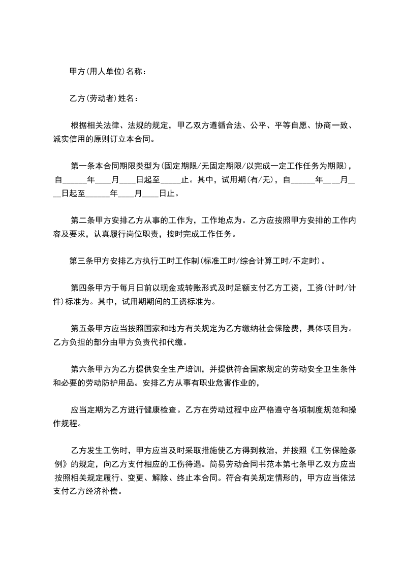 乙方发生工伤时,甲方应当及时采取措施使乙方得到救治,并按照《工伤保险条例》的规定,向乙方支付相应的工伤待遇。简易劳动合同书范本第七条甲乙双方应当按照相关规定履行、变更、解除、终止本合同。符合有关规定情形的,甲方应当依法支付乙方经济补偿。