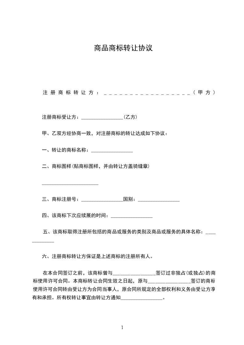 1.甲方保证所转让的商标是其合法拥有的,且该商标不存在任何权利瑕疵,包括但不限于商标被撤销、被宣告无效、存在权属争议等情况。