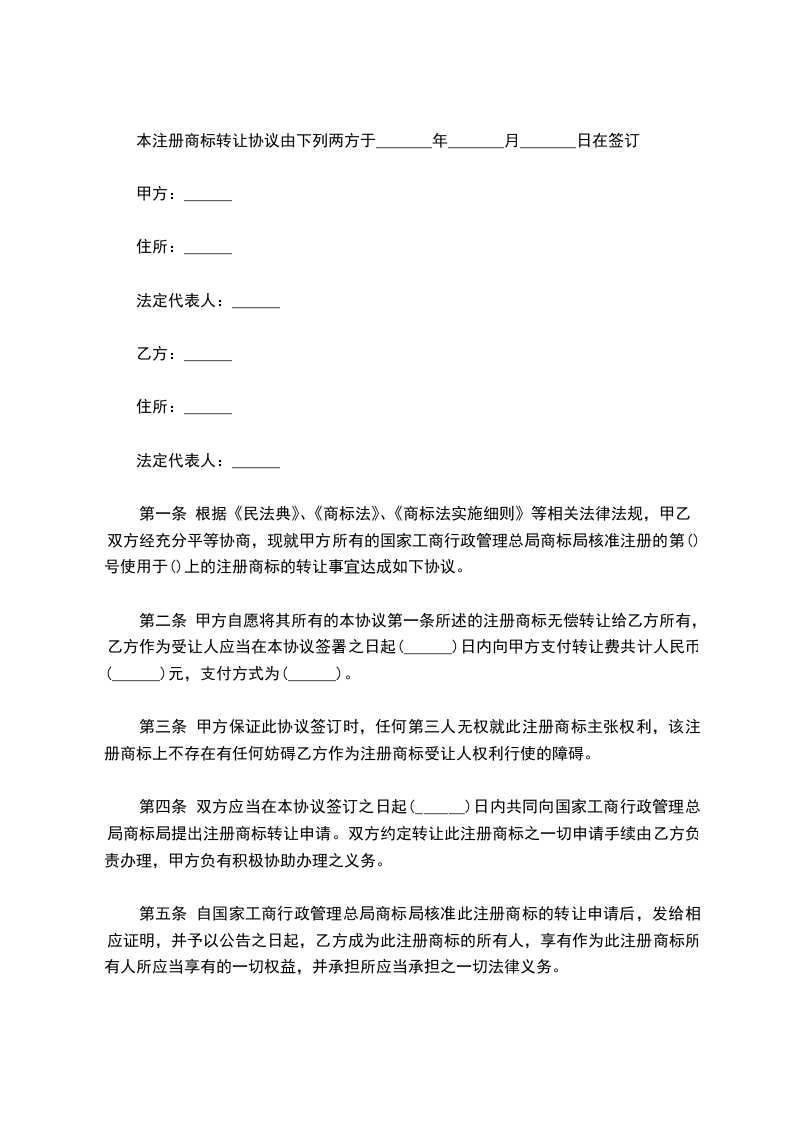 鉴于甲方拥有[商标名称]商标(商标注册号:[商标注册号]),并有意将该商标转让给乙方,乙方愿意受让该商标,经双方友好协商,依据《中华人民共和国民法典》及相关法律法规的规定,达成如下协议: