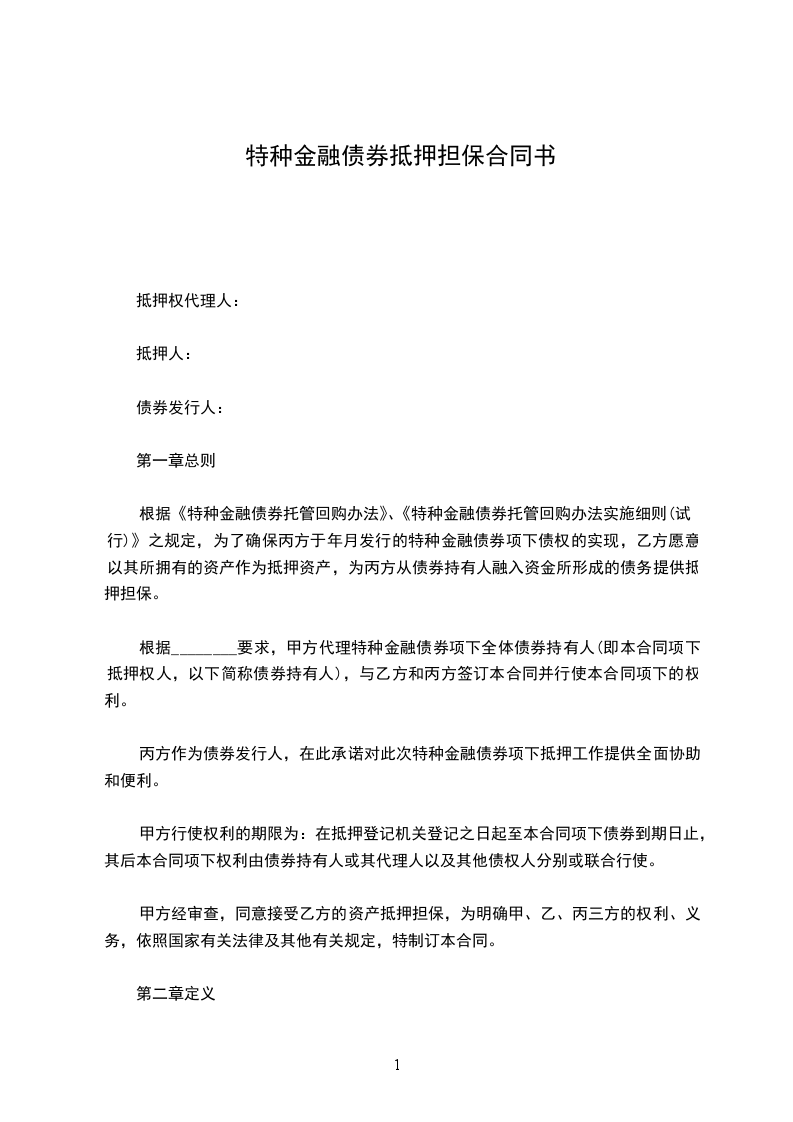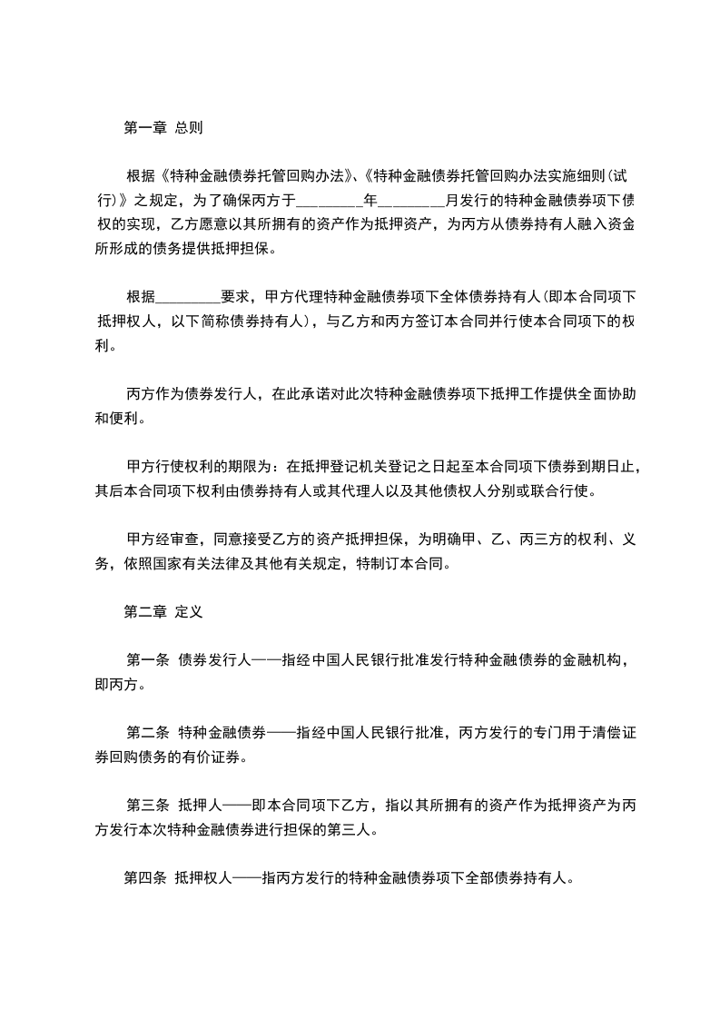 根据《特种金融债券托管回购办法》、《特种金融债券托管回购办法实施细则(试行)》之规定,为了确保丙方于_________年_________月发行的特种金融债券项下债权的实现,乙方愿意以其所拥有的资产作为抵押资产,为丙方从债券持有人融入资金所形成的债务提供抵押担保。