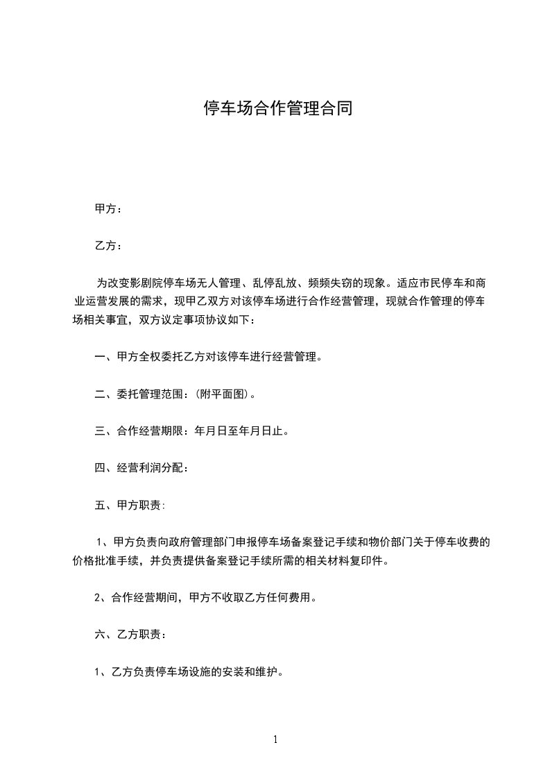 为改变影剧院停车场无人管理、乱停乱放、频频失窃的现象。适应市民停车和商业运营发展的需求,现甲乙双方对该停车场进行合作经营管理,现就合作管理的停车场相关事宜,双方议定事项协议如下: