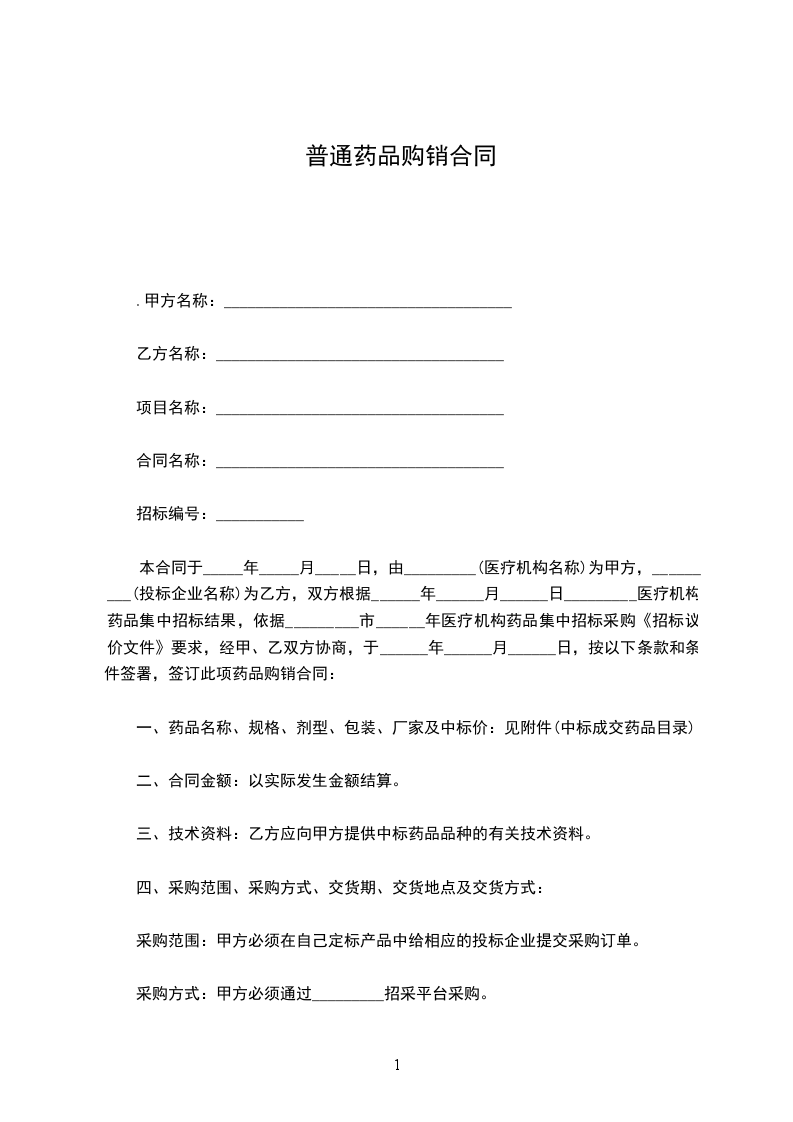 本合同于_____年_____月_____日,由_________(医疗机构名称)为甲方,_________(投标企业名称)为乙方,双方根据______年______月______日_________医疗机构药品集中招标结果,依据_________市______年医疗机构药品集中招标采购《招标议价文件》要求,经甲、乙双方协商,于______年______月______日,按以下条款和条件签署,签订此项药品购销合同: