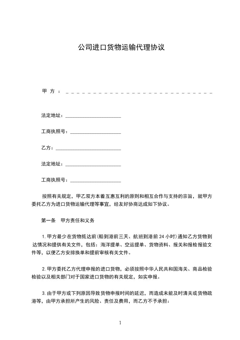 1.乙方应及时、合理安排甲方所委托进口货物的的换单、申报、运输等事宜。