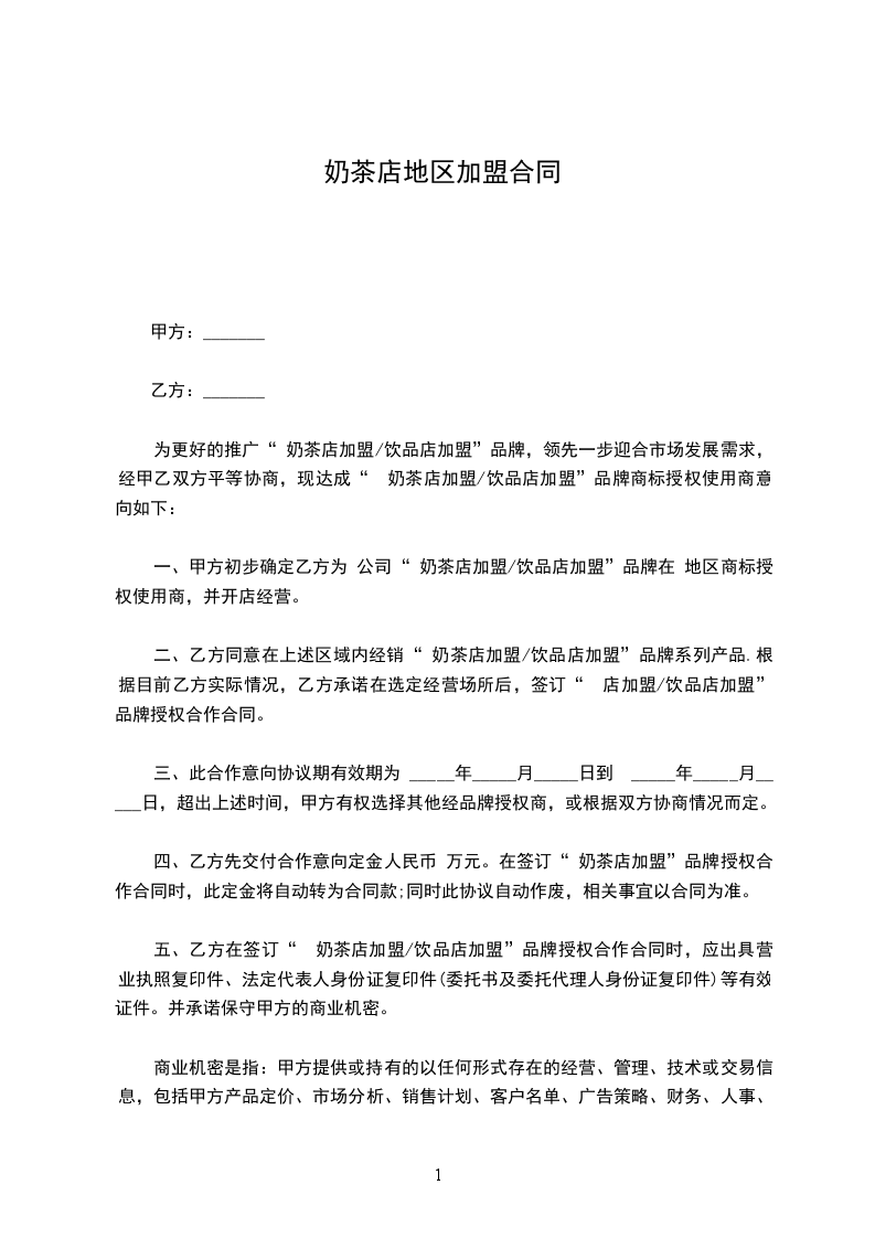 篇1奶茶店加盟供货合同