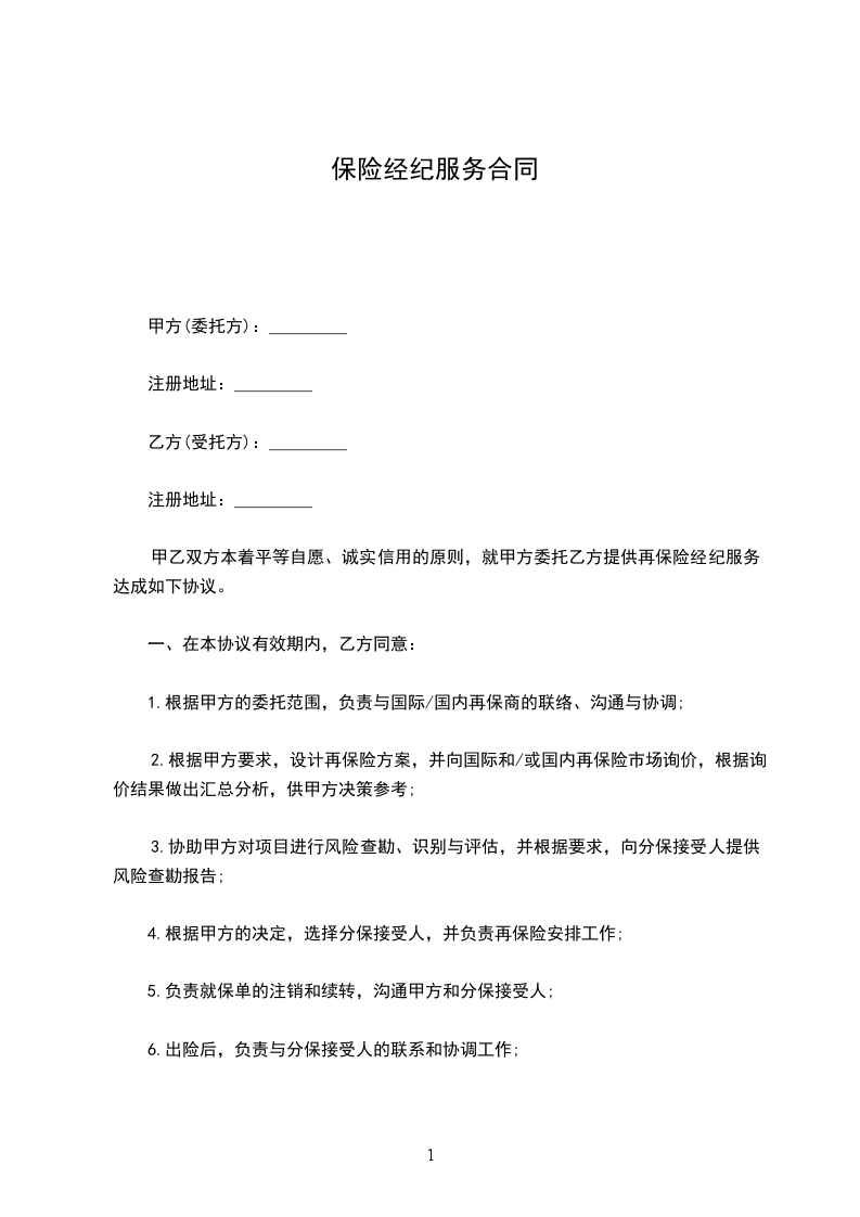 甲乙双方本着平等自愿、诚实信用的原则,就甲方委托乙方提供再保险经纪服务达成如下协议。