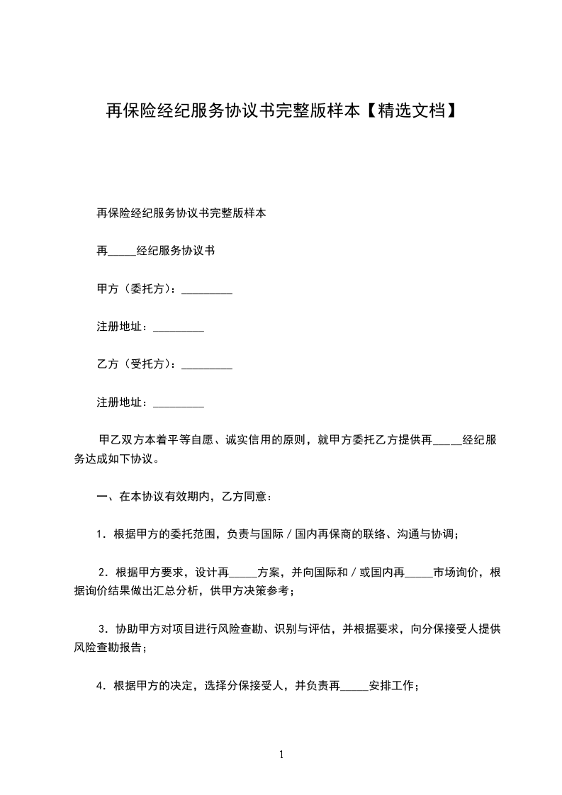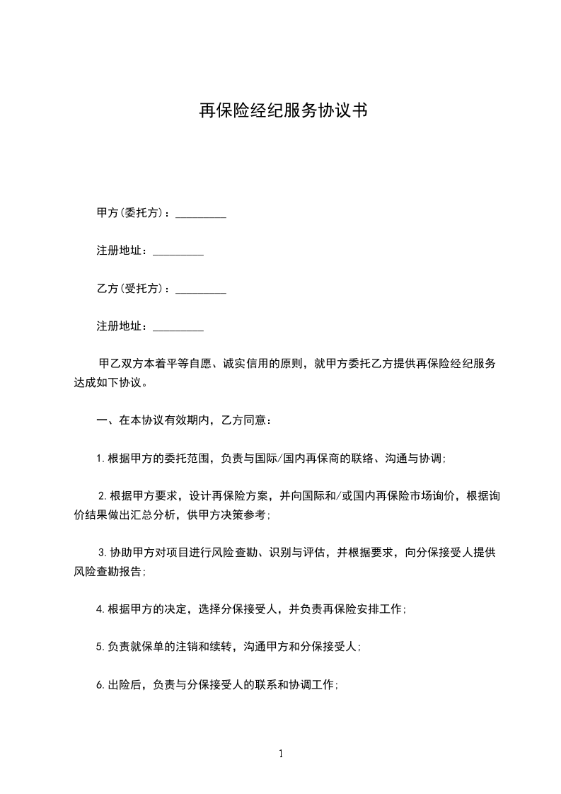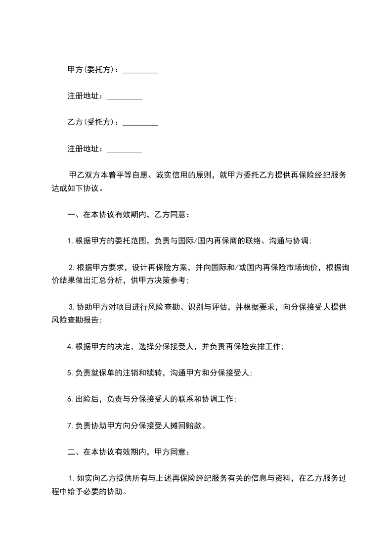 甲乙双方本着平等自愿、诚实信用的原则,就甲方委托乙方提供再保险经纪服务达成如下协议。