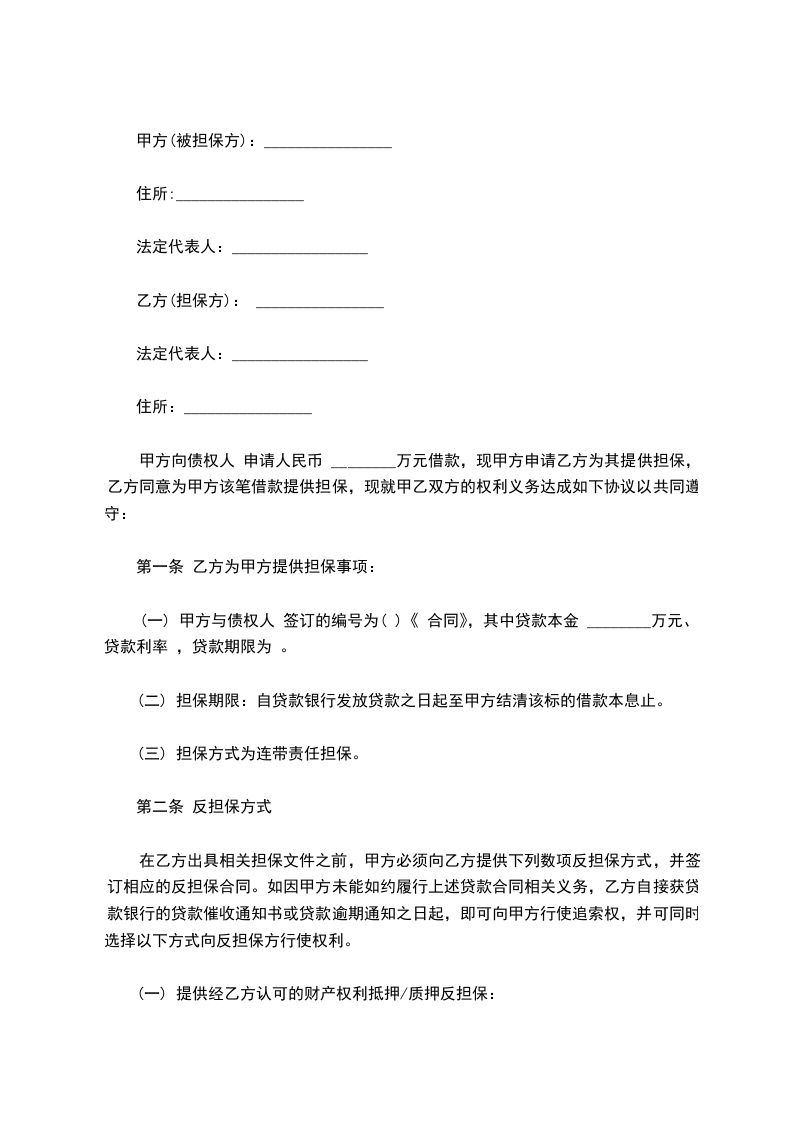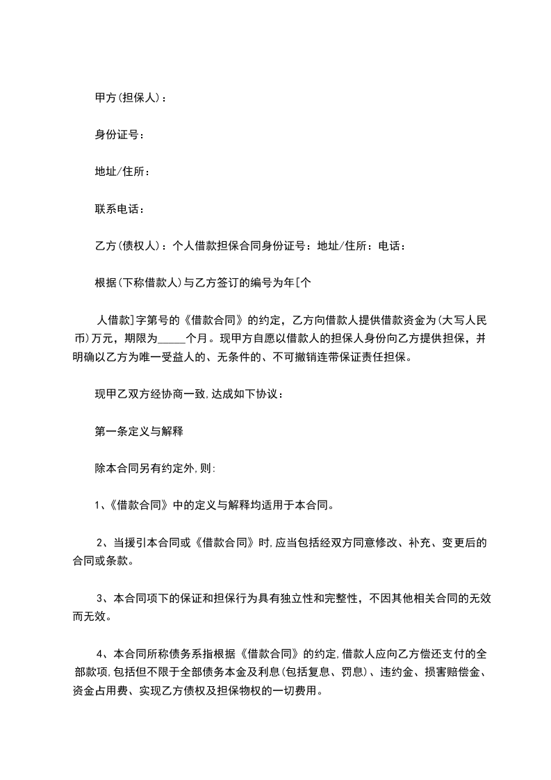 乙方(债权人):个人借款担保合同身份证号:地址/住所:电话: