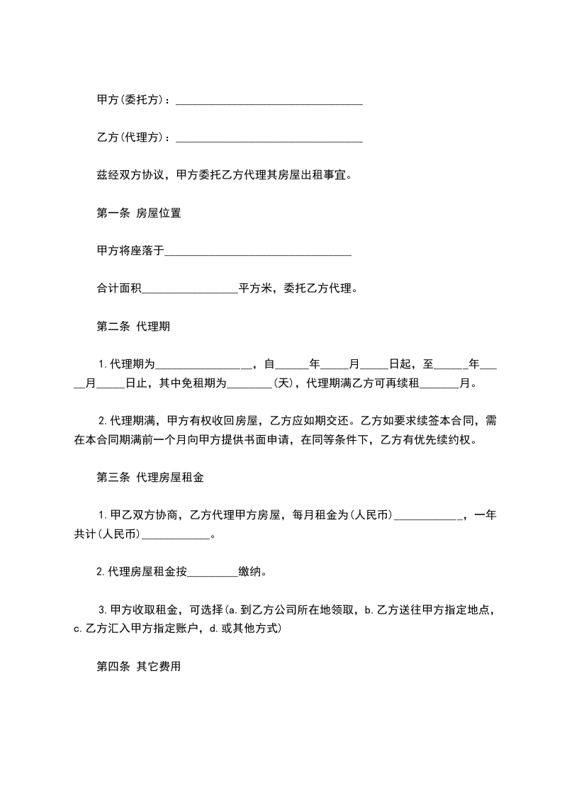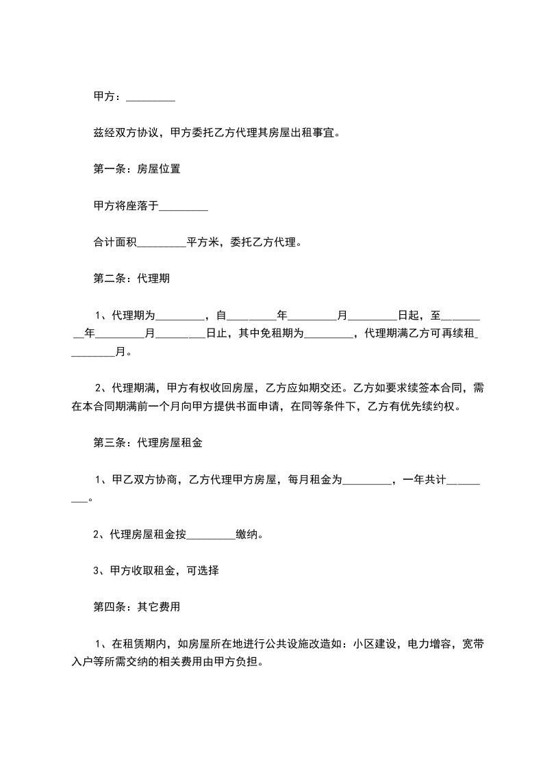 1、在委托期内,如乙方将甲方房屋租出时(签订租赁合同,或实际开始履行出租行为时),甲方一次性支付租房合同总金额的1/12给甲方作为服务费。