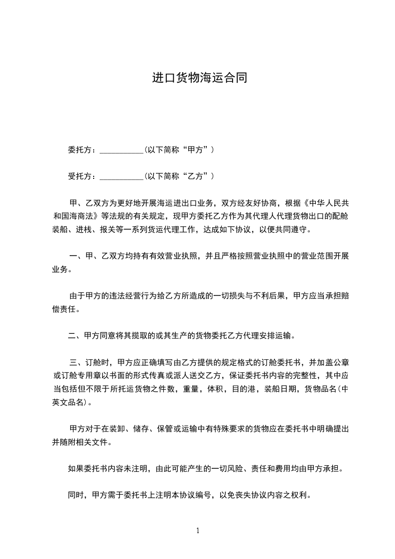 甲、乙双方为更好地开展海运进出口业务,双方经友好协商,根据《中华人民共和国海商法》等法规的有关规定,现甲方委托乙方作为其代理人代理货物出口的配舱、装船、进栈、报关等一系列货运代理工作,达成如下协议,以便共同遵守。