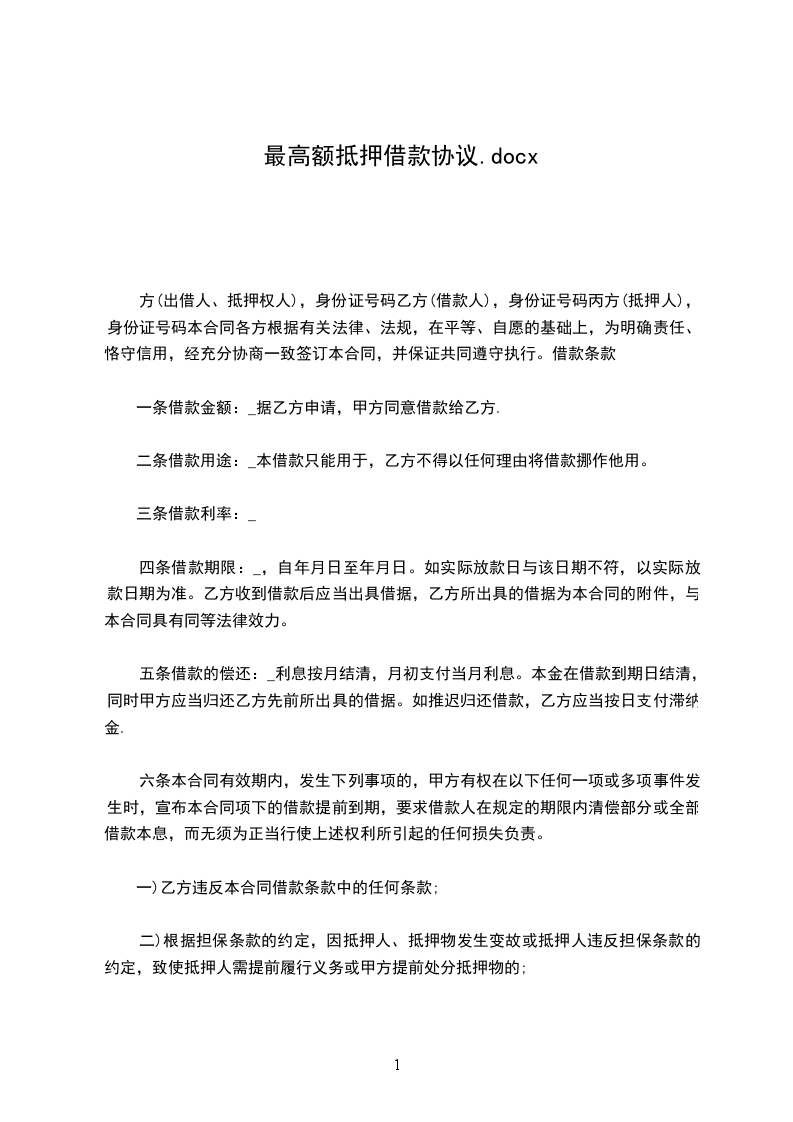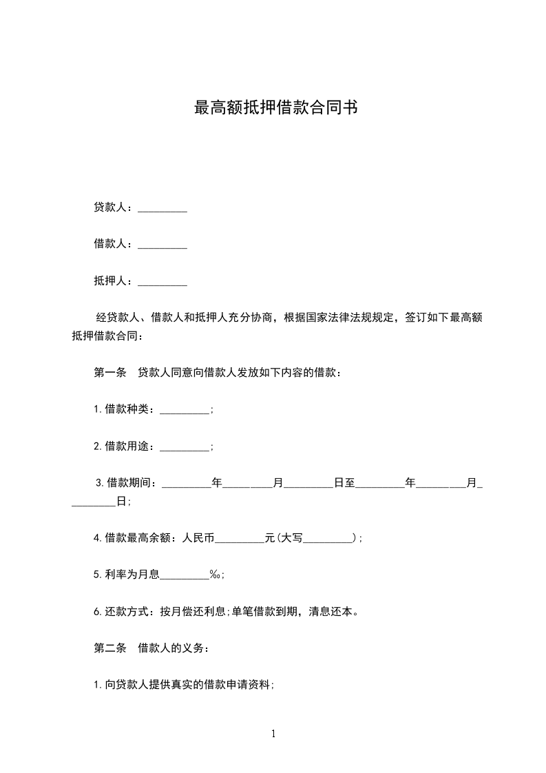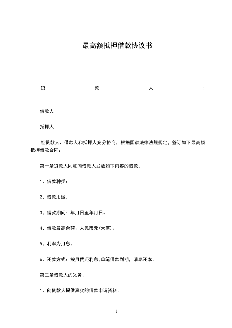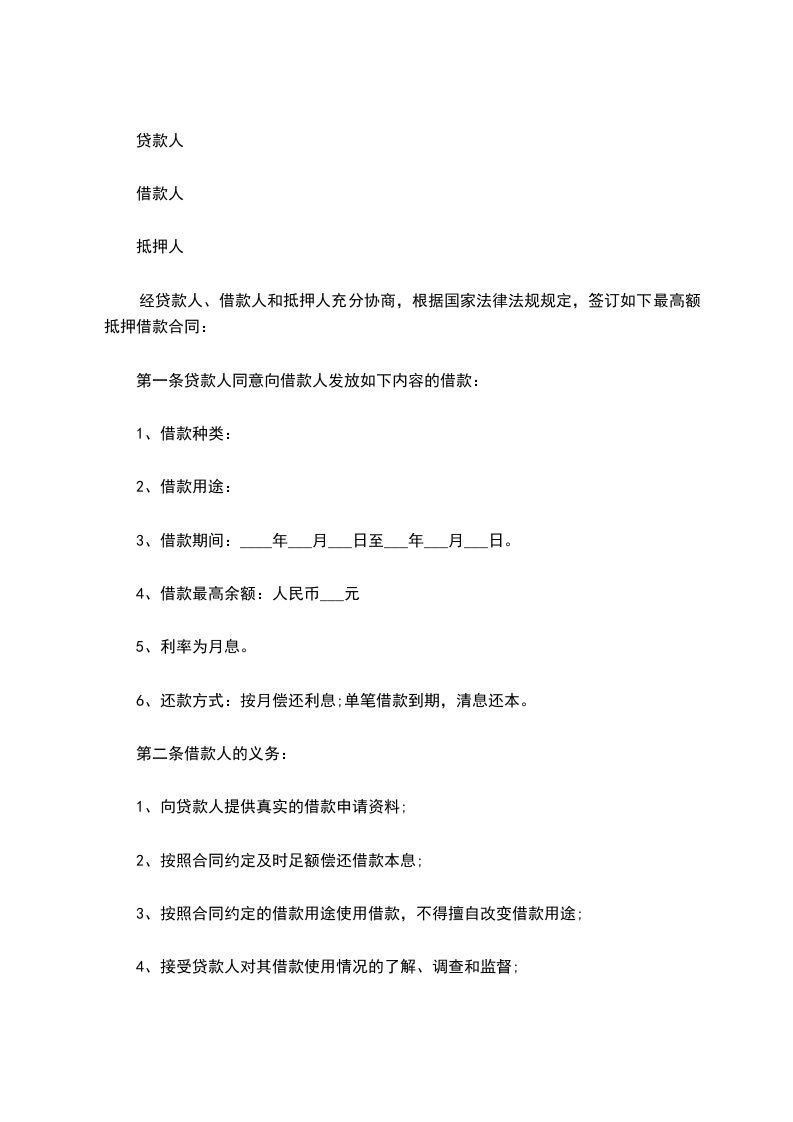 经贷款人、借款人和抵押人充分协商,根据国家法律法规规定,签订如下最高额抵押借款合同: