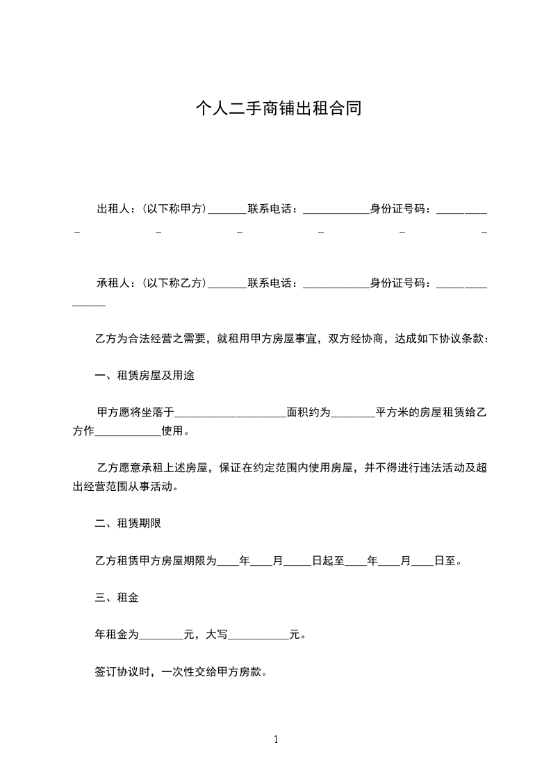 承租人:(以下称乙方)_______联系电话:____________身份证号码:_______________