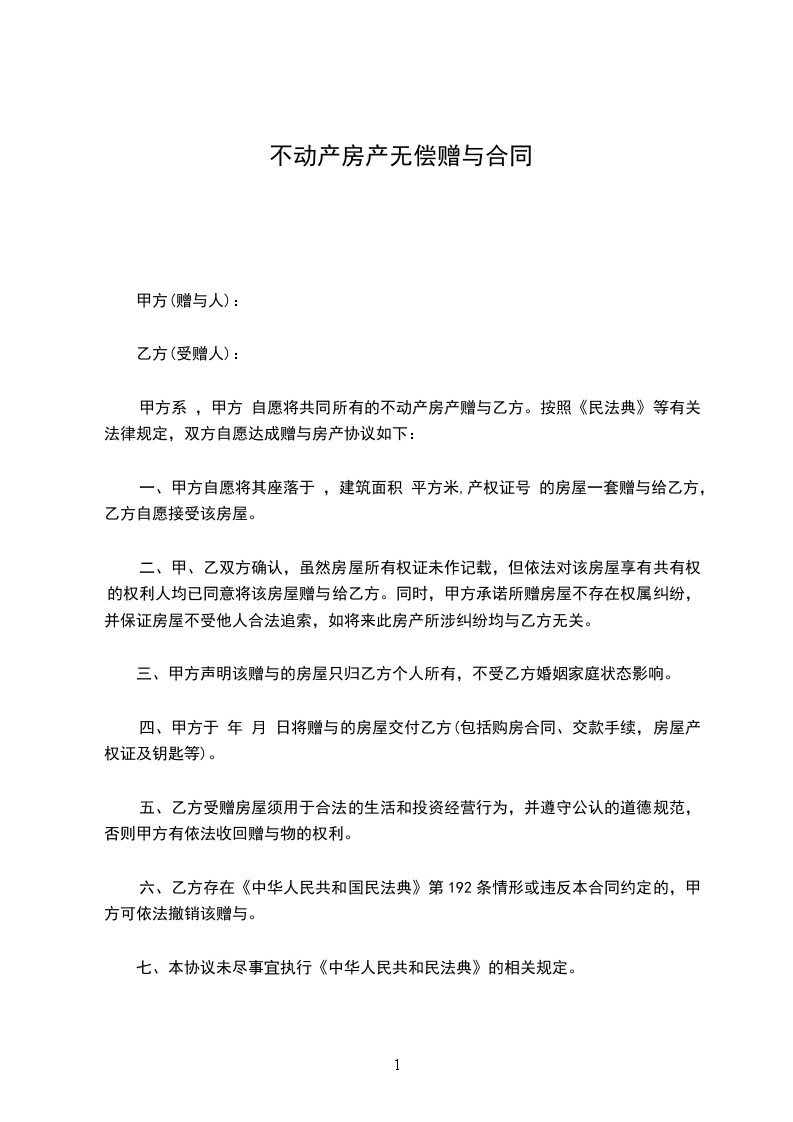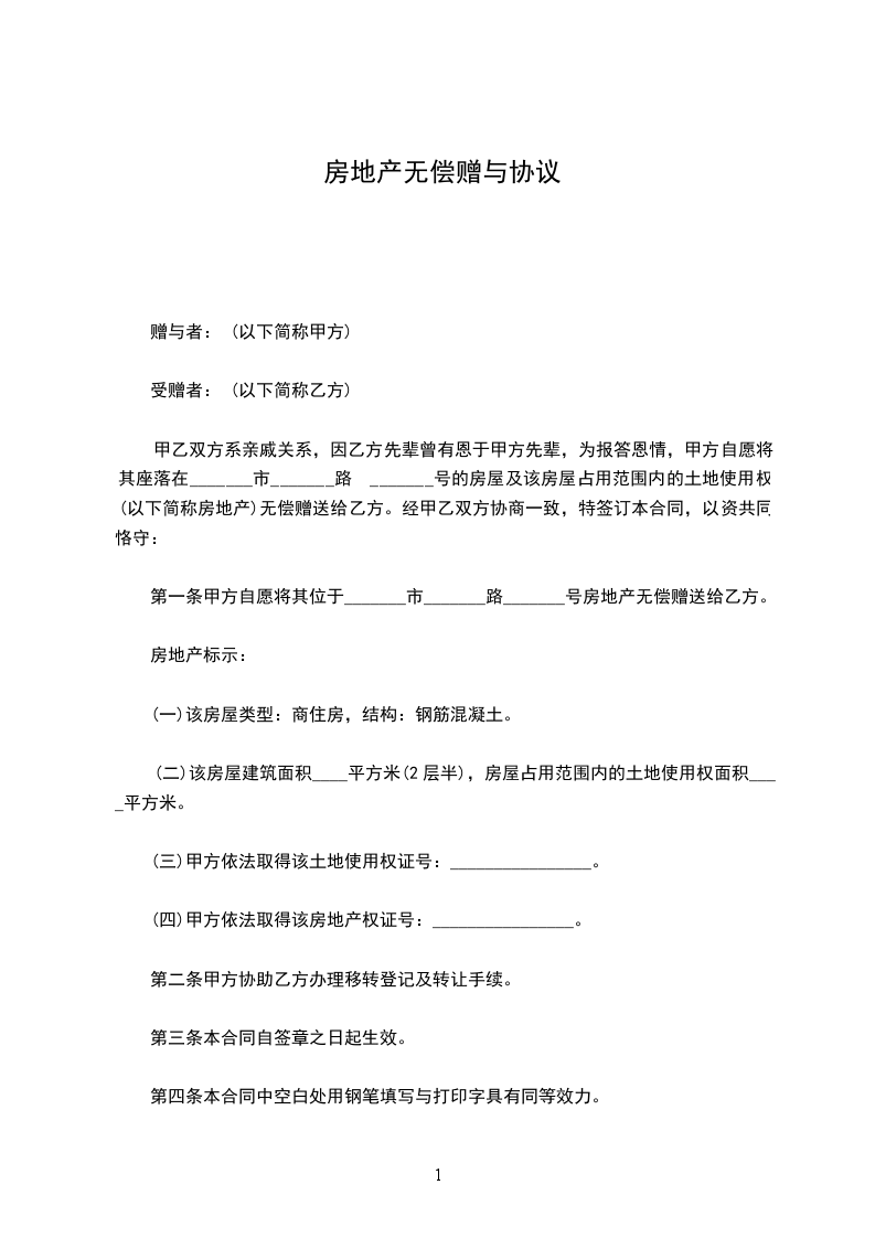 第一条甲方决定将位于_________区_________街_________楼_________层_________号的房屋一套,建筑面积_________平方米无偿赠与给乙方;乙方同意接受此赠与。