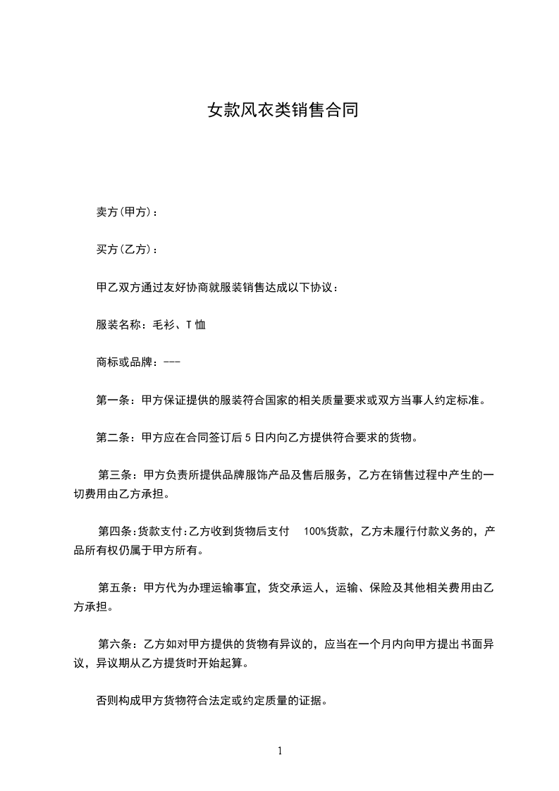 第一条:甲方保证提供的服装符合国家的相关质量要求或双方当事人约定标准。