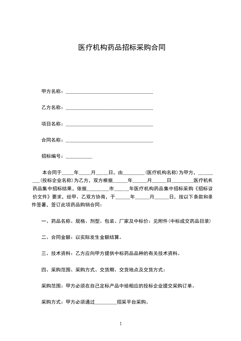 本合同于_____年_____月_____日,由_________(医疗机构名称)为甲方,_________(投标企业名称)为乙方,双方根据______年______月______日_________医疗机构药品集中招标结果,依据_________市______年医疗机构药品集中招标采购《招标议价文件》要求,经甲、乙双方协商,于______年______月______日,按以下条款和条件签署,签订此项药品购销合同: