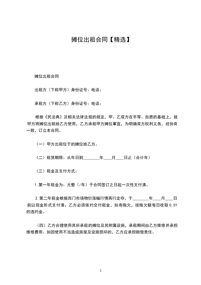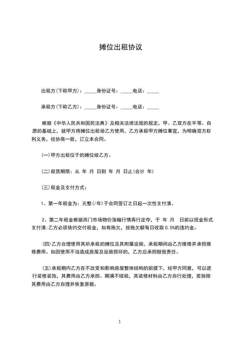 根据《中华人民共和国民法典》及相关法律法规的规定,甲乙双方在平等、自愿、公平、诚实信用的基础上,就甲方将房屋摊位出租给乙方事宜,达成如下协议: