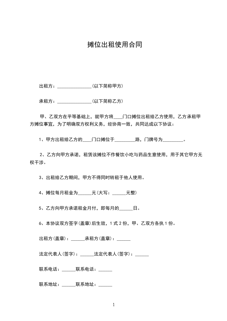 1.甲方将位于______________________(房屋具体地址)的房屋出租给乙方,乙方租赁该房屋作为______________________(摊位用途)使用。
