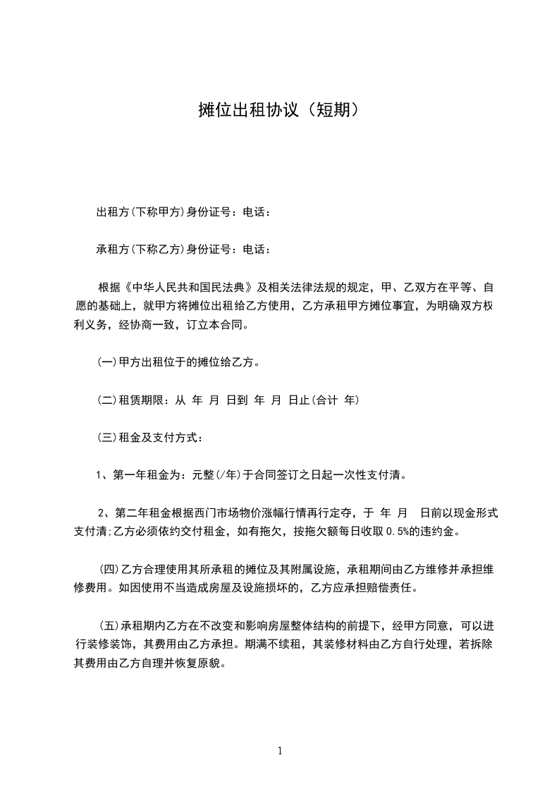篇1房屋出租摊位合同