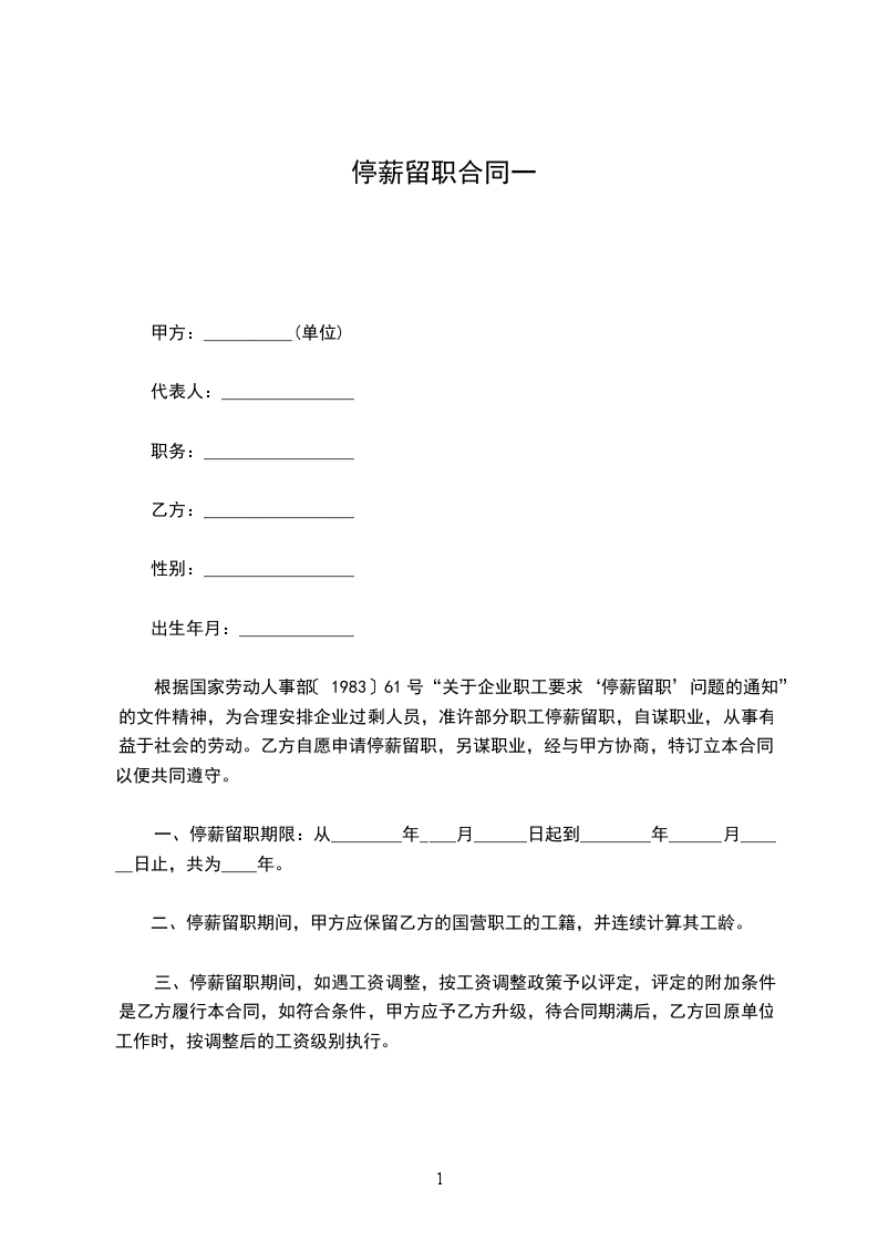 根据国家劳动人事部〔1983〕61号“关于企业职工要求‘停薪留职’问题的通知”的文件精神,为合理安排企业过剩人员,准许部分职工停薪留职,自谋职业,从事有益于社会的劳动。乙方自愿申请停薪留职,另谋职业,经与甲方协商,特订立本合同,以便共同遵守。