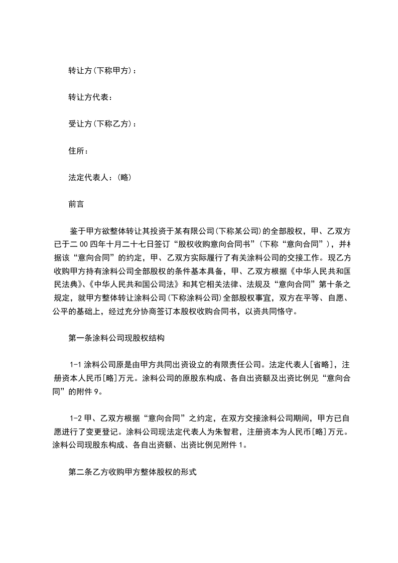 鉴于甲方欲整体转让其投资于某有限公司(下称某公司)的全部股权,甲、乙双方已于二00四年十月二十七日签订“股权收购意向合同书”(下称“意向合同”),并根据该“意向合同”的约定,甲、乙双方实际履行了有关涂料公司的交接工作。现乙方收购甲方持有涂料公司全部股权的条件基本具备,甲、乙双方根据《中华人民共和国民法典》、《中华人民共和国公司法》和其它相关法律、法规及“意向合同”第十条之规定,就甲方整体转让涂料公司(下称涂料公司)全部股权事宜,双方在平等、自愿、公平的基础上,经过充分协商签订本股权收购合同书,以资共同恪守。