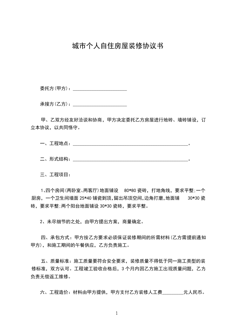 城市个人自住房屋装修协议书