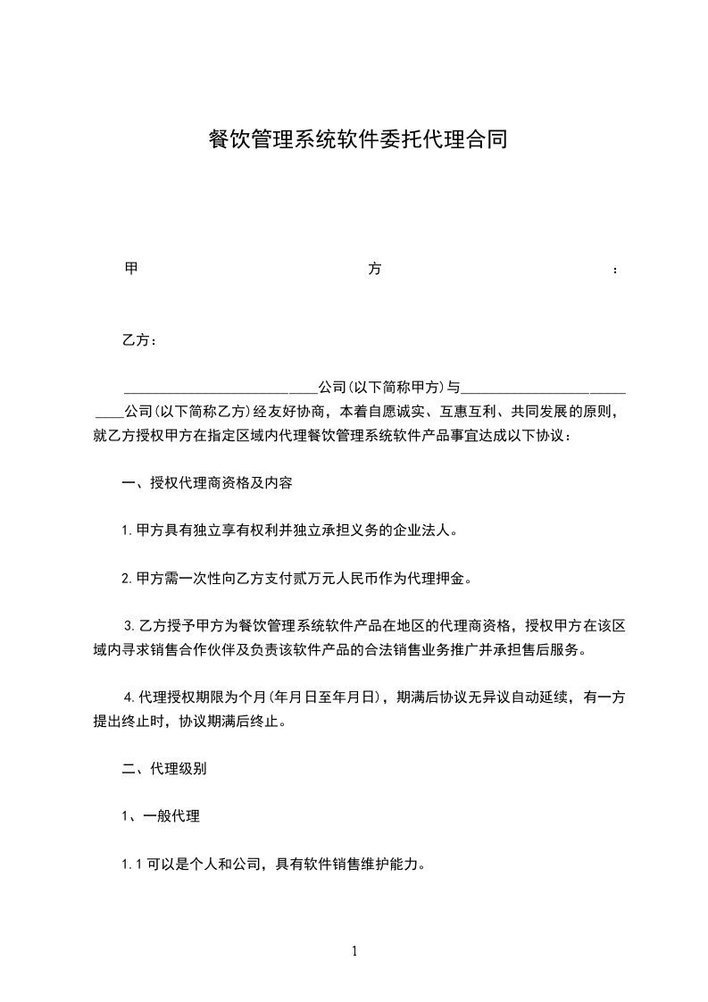 ___________________________公司(以下简称甲方)与___________________________公司(以下简称乙方)经友好协商,本着自愿诚实、互惠互利、共同发展的原则,就乙方授权甲方在指定区域内代理餐饮管理系统软件产品事宜达成以下协议: