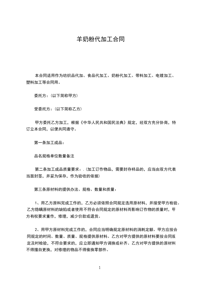 本合同适用作为纺织品代加、食品代加工、奶粉代加工、带料加工、电镀加工、塑料加工等合同用。