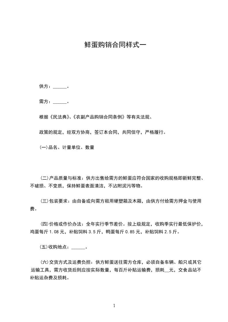(十一)其它:供方现存生产鸡蛋__只鸭蛋__只,若需淘汰更新,须经双方协商同意,才能减少货数量,白壳鸡蛋按收购价收购,不补贴运杂费和饲料。
