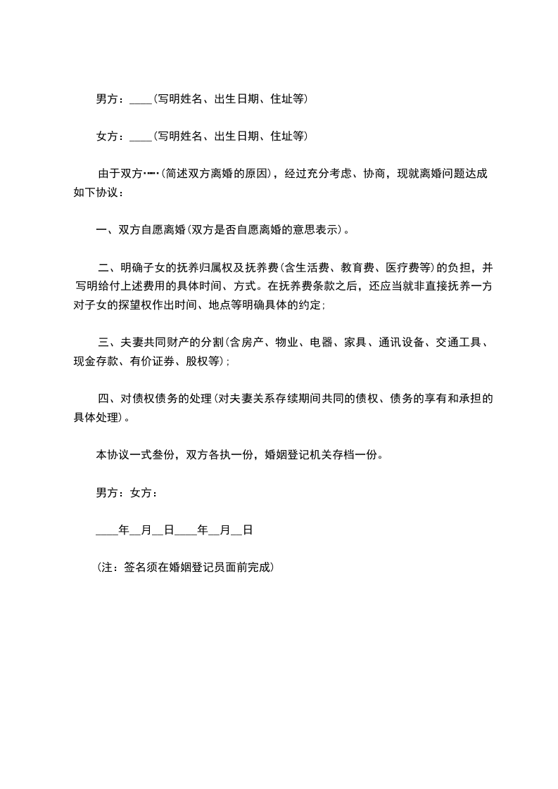 由于双方……(简述双方离婚的原因),经过充分考虑、协商,现就离婚问题达成如下协议: