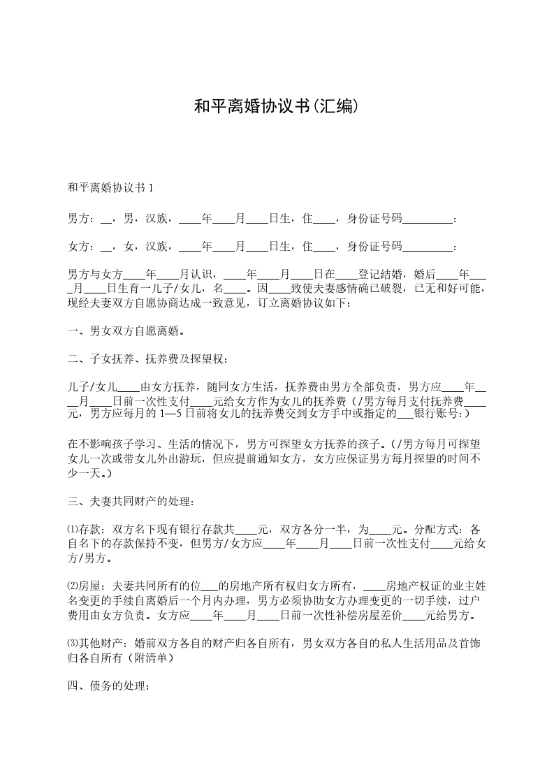 四、对债权债务的处理(对夫妻关系存续期间共同的债权、债务的享有和承担的具体处理)。