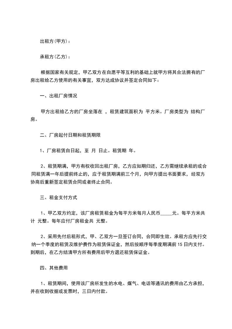 根据国家有关法律规定,甲、乙双方在自愿、平等地、互利的基础上,经甲、乙双方充分协商,甲方将其合法拥有的厂房出租给乙方使用。双方达成合同如下: