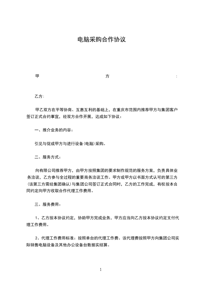 甲乙双方在平等协商、互惠互利的基础上,在重庆市范围内推荐甲方与集团客户签订正式合约事宜,经双方合作开展,达成如下协议: