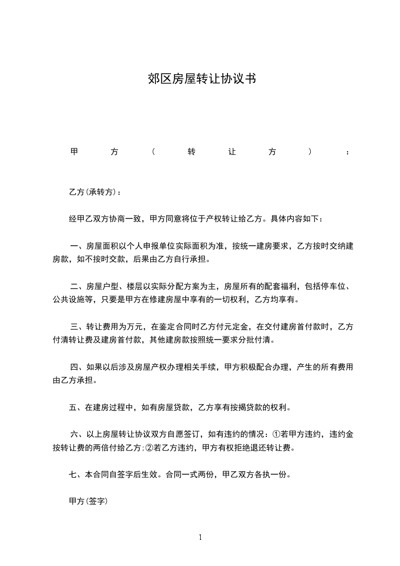 六、以上房屋转让协议双方自愿签订,如有违约的情况:①若甲方违约,违约金按转让费的两倍付给乙方;②若乙方违约,甲方有权拒绝退还转让费。