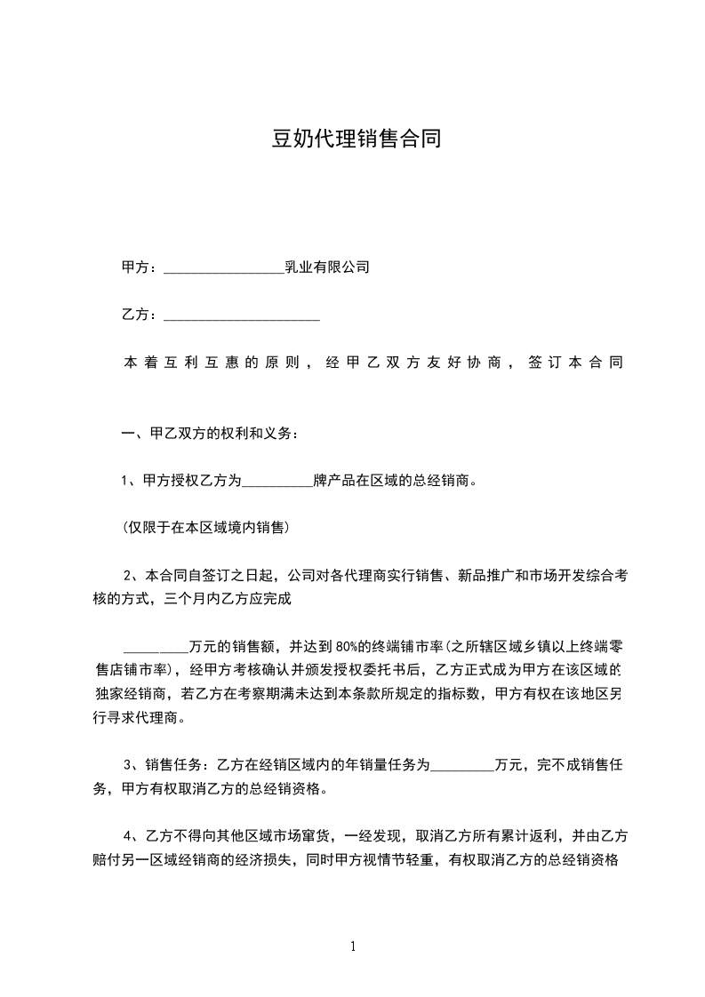 3、销售任务:乙方在经销区域内的年销量任务为_________万元,完不成销售任务,甲方有权取消乙方的总经销资格。