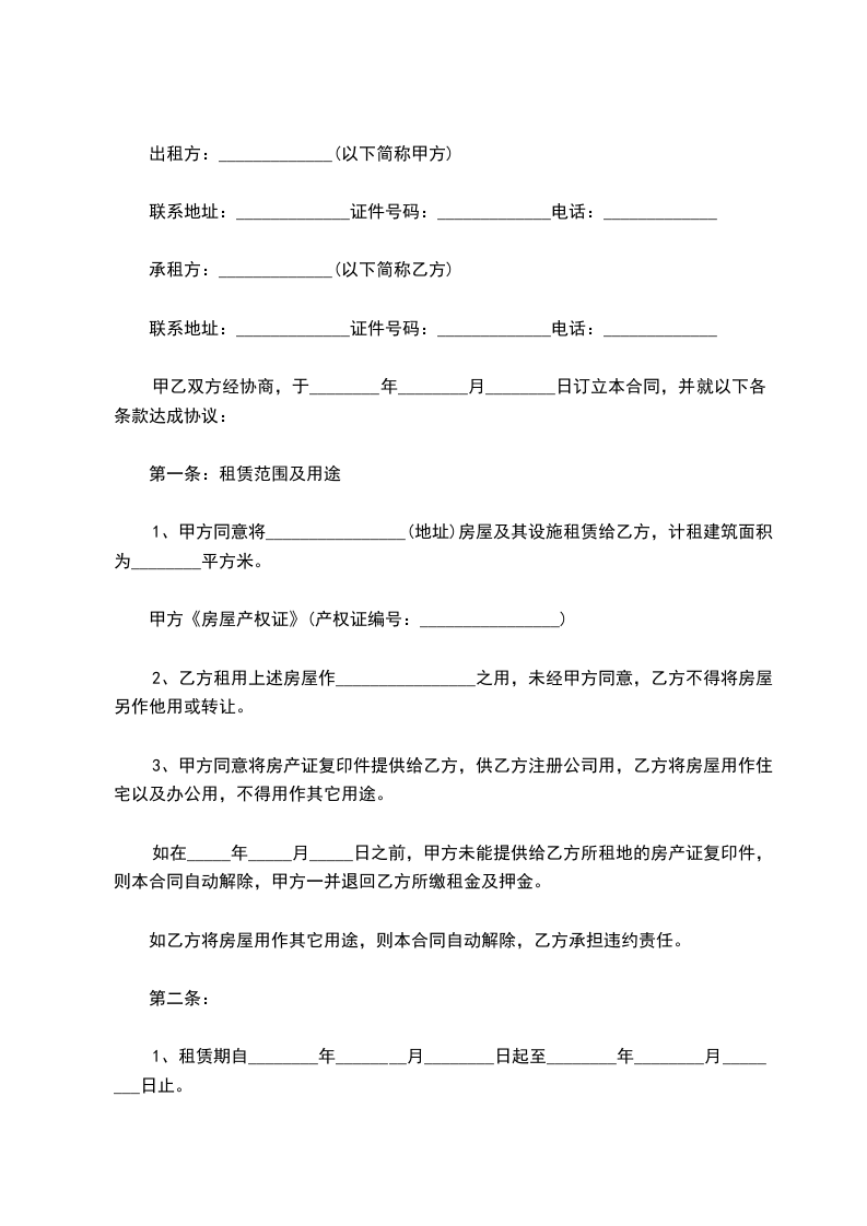 3、甲方同意将房产证复印件提供给乙方,供乙方注册公司用,乙方将房屋用作住宅以及办公用,不得用作其它用途。