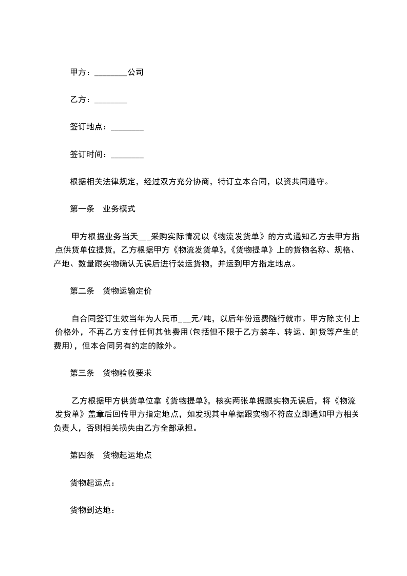 2.1乙方保证在_____________年_____________月_____________日之前将全部货物送到货运公司发出。