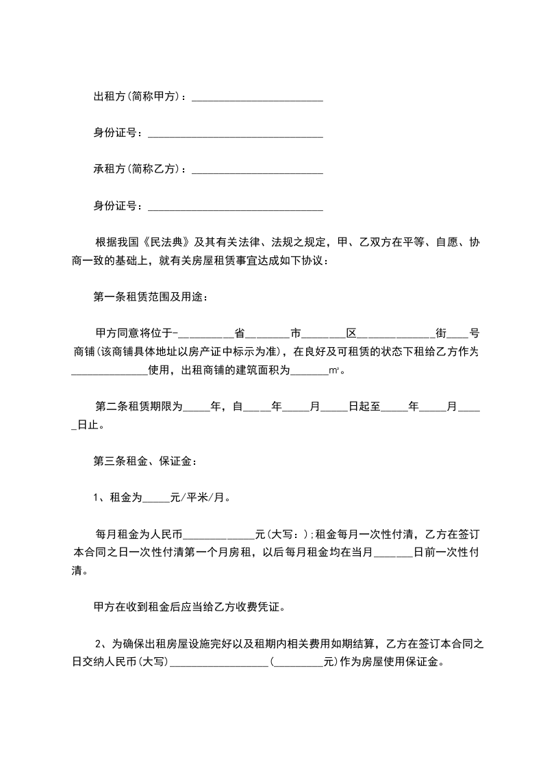 甲方同意将位于-__________省________市________区______________街____号商铺(该商铺具体地址以房产证中标示为准),在良好及可租赁的状态下租给乙方作为______________使用,出租商铺的建筑面积为_______㎡。