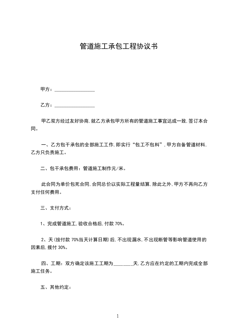 甲乙双方经过友好协商,就乙方承包甲方所有的管道施工事宜达成一致,签订本合同。